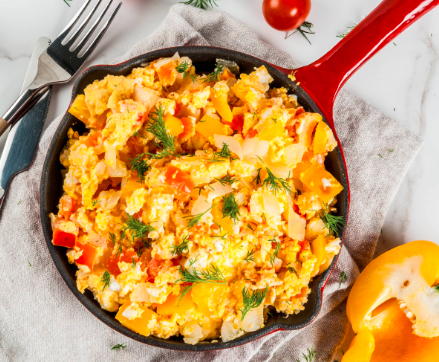 Huevo revuelto con chorizo y guarnición de frijoles.