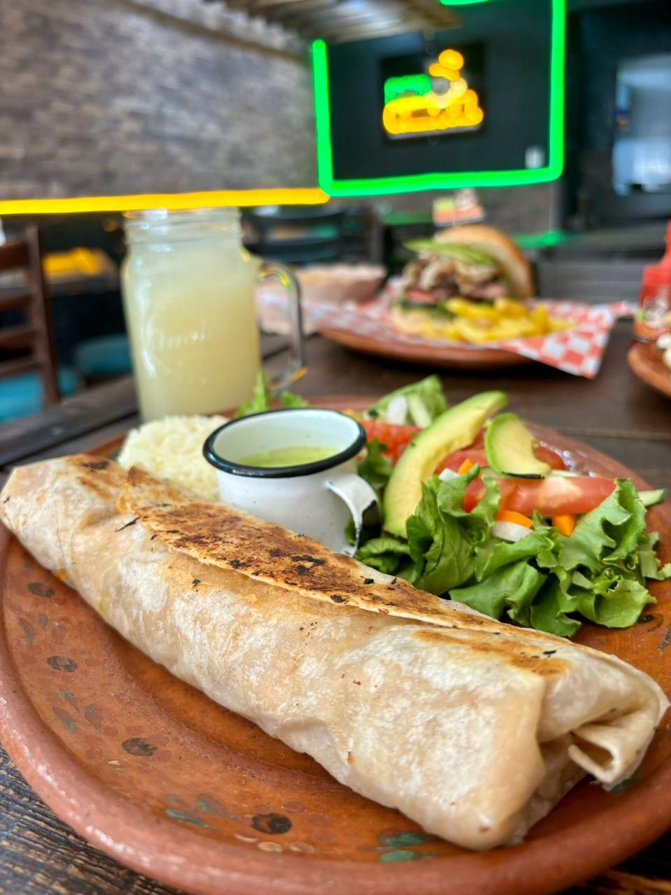 Tortilla de harina burrera, chorizo, frijoles y queso oaxaca.