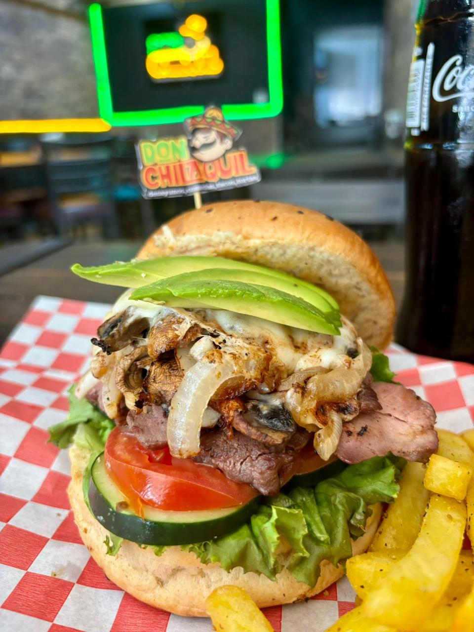 Arrachera, lechuga, jitomate, aguacate, queso, cebolla, champiñon, pepino y papas a la francesa.