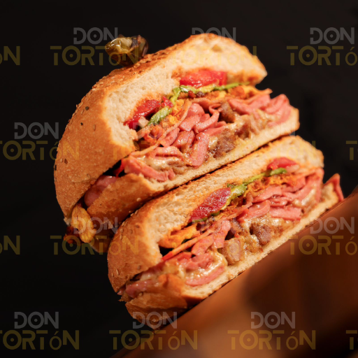 Milanesa, salchicha, pierna, tocino, queso blanco y queso amarillo, aguacate, jitomate, cebolla, salsa de la casa.