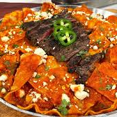 Totopos (trozos de tortilla frita) bañados en una salsa de chile rojo picosita, coronados con Arrachera (carne de res marinada y frita), y complementados con crema, queso desmoronado (Ranchero), cebolla picada servidos con frijoles y pico de gallo.