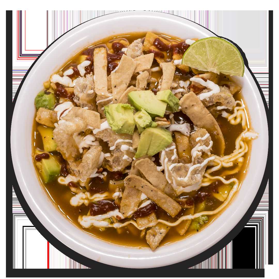 Sopa de tortilla acompañado de queso panela, aguacate, frituras, chile chipotle, media crema y chicharron.