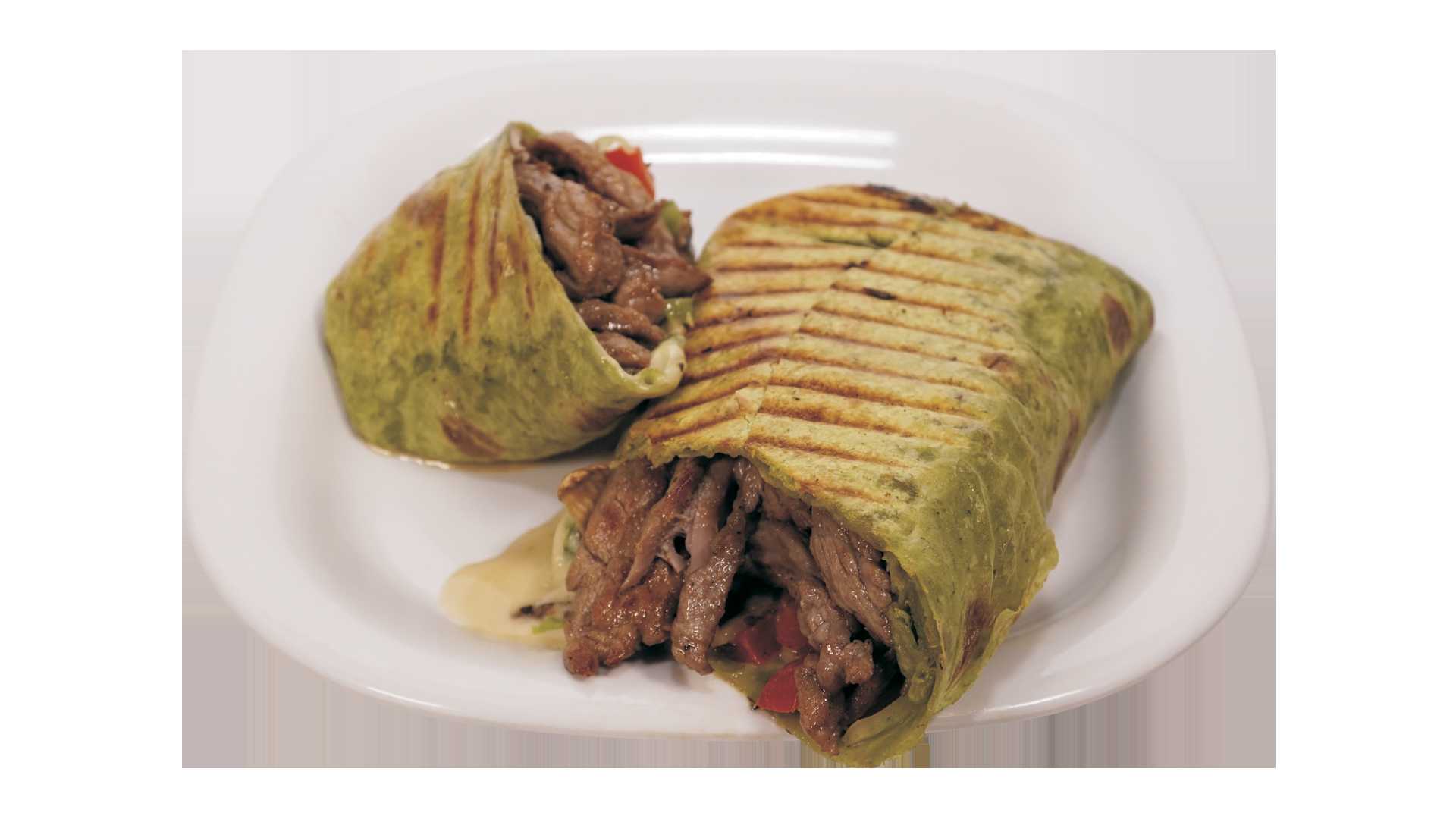 Wrap de arrachera, lechuga, pimientos, champiñon, cebolla y queso suizo, acompañado de salsa chipotle.