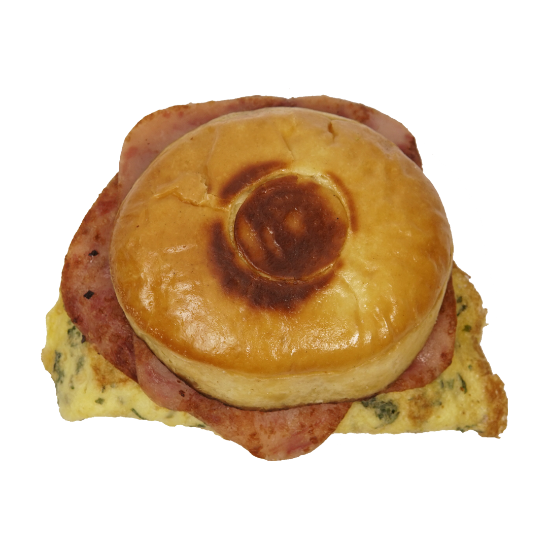 Suave Bisquet con omelette, queso suizo y salchicha, tocino o jamon.