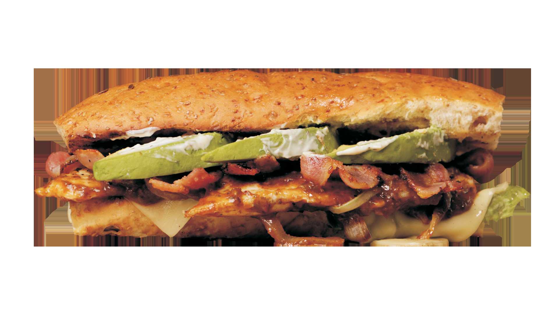 Baguette de pollo en salsa chipotle, aguacate, queso suizo derretido y tocino, acompañado de aderezo ranch.