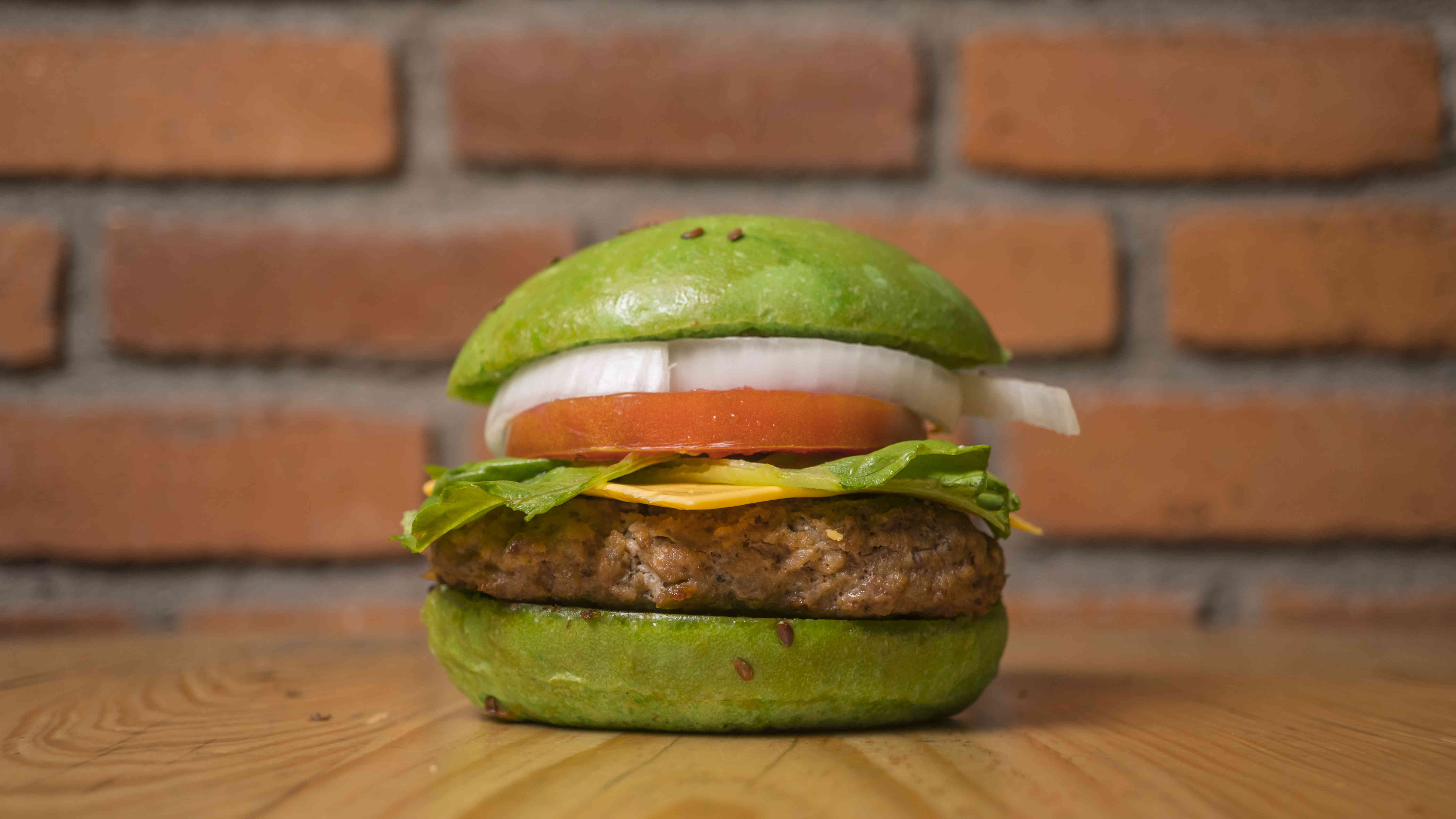 hamburguesa con carne, queso panela, aguacate, germinado, lechuga, tomate y cebolla.