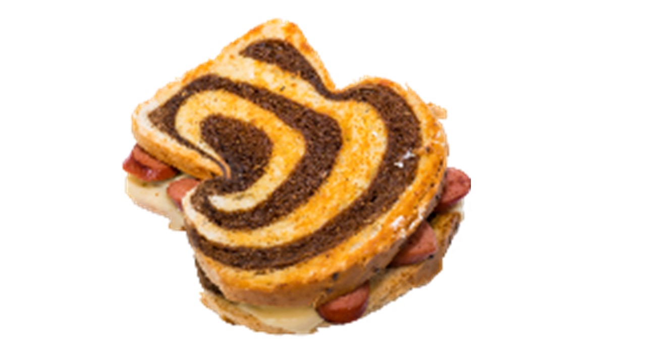 Pan marmoleado con queso suizo. Agregar jamon, salchicha o tocino.