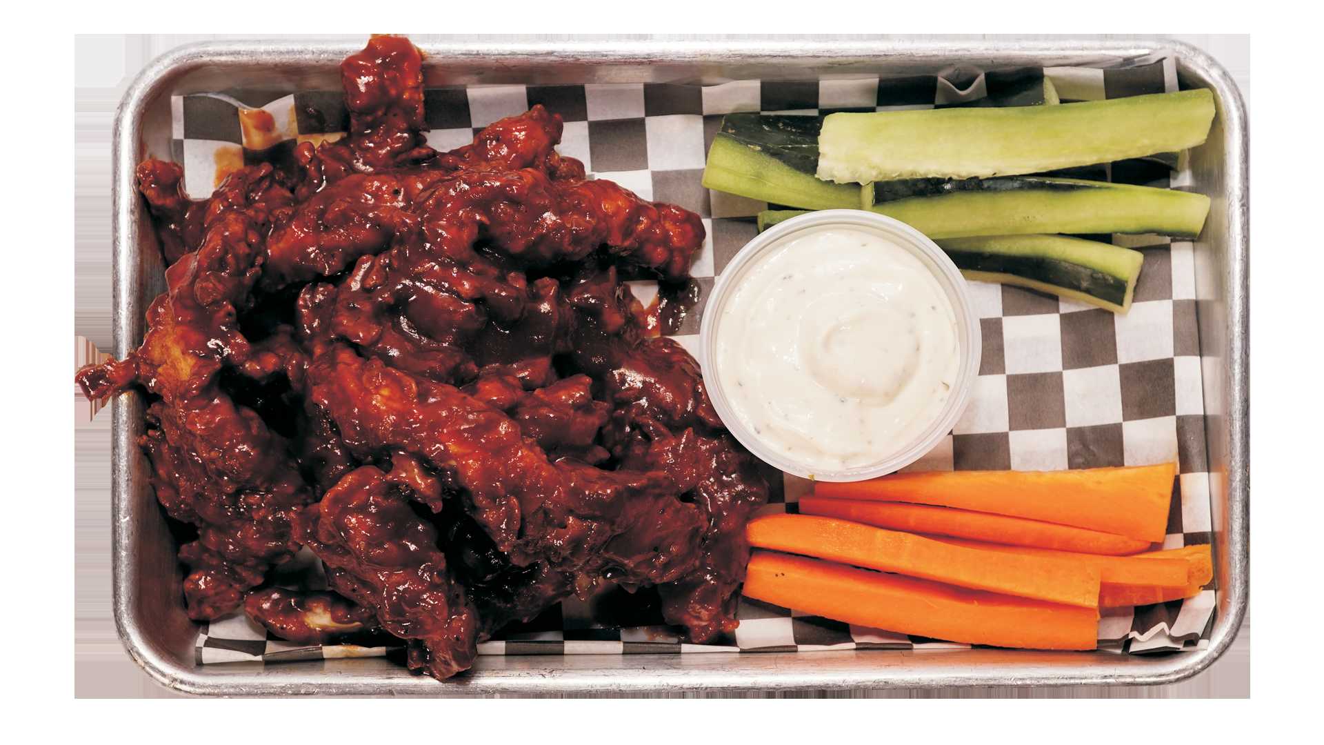 Panini de boneless bbq, cebolla asada, lechuga, tomate y aguacate, acompañado de aderezo ranch.
