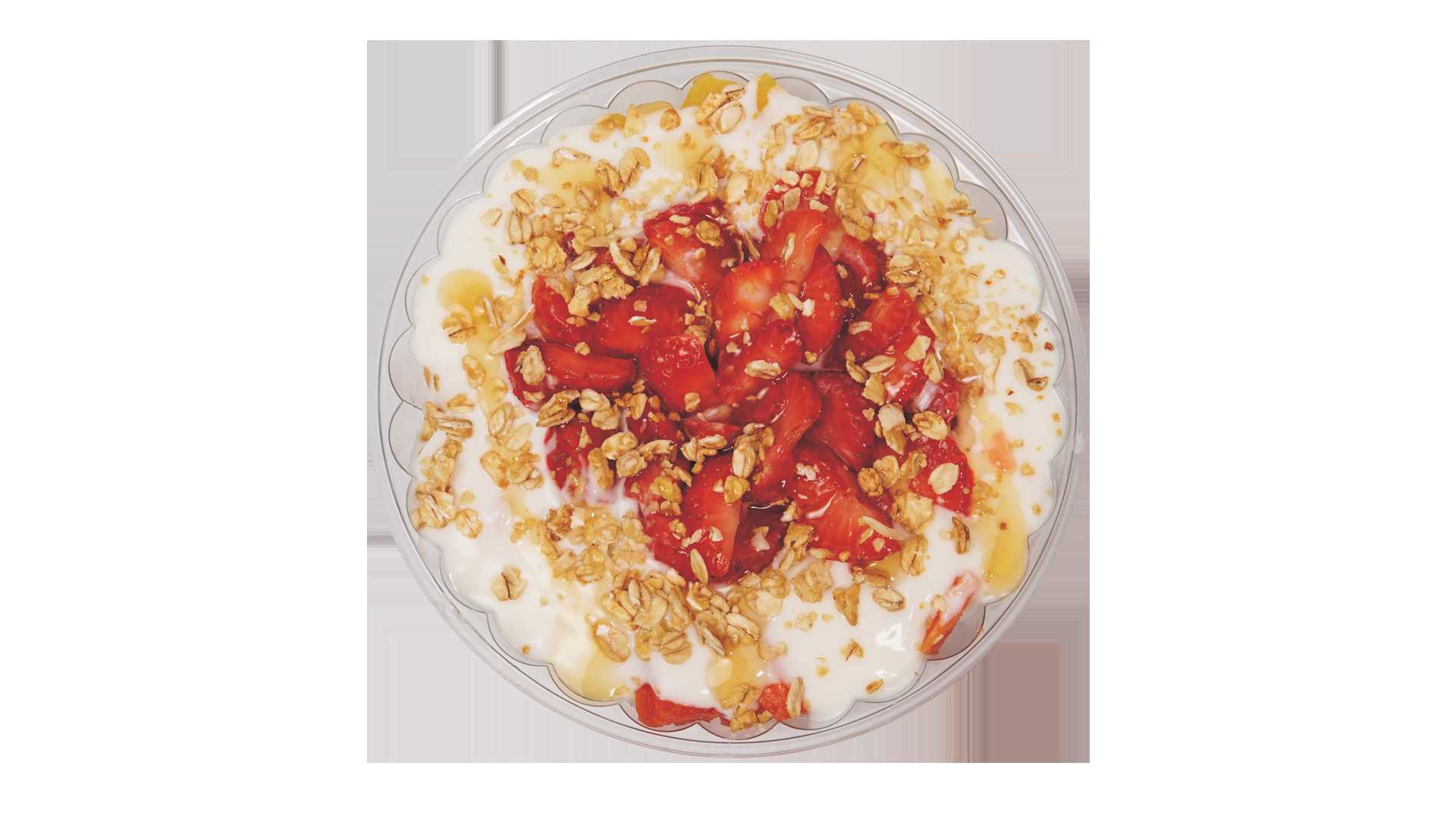 Gran porcion de yogurt con frutas de temporada, franola y miel de abeja.