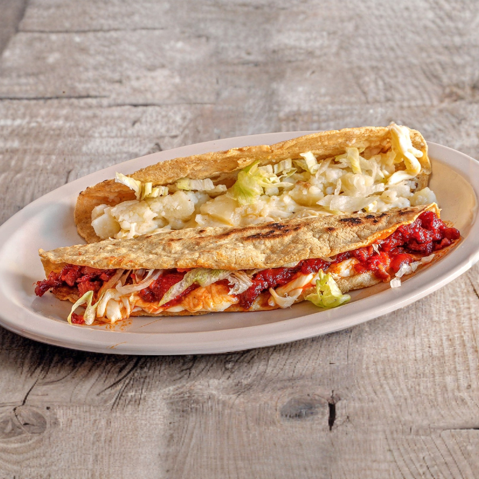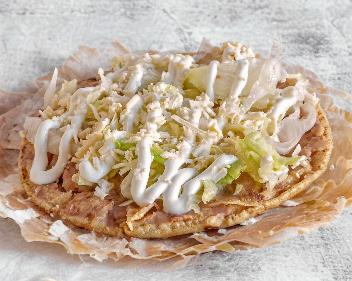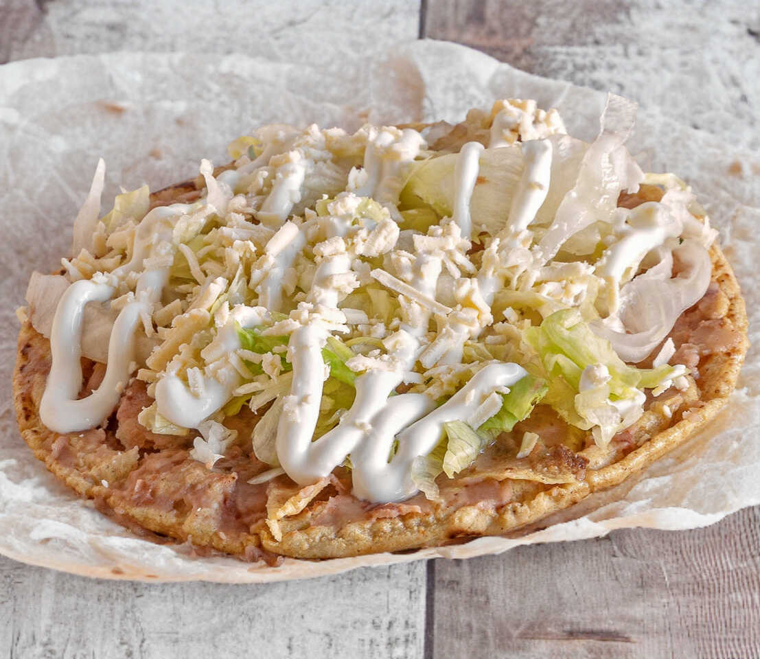 Bistec, chorizo, pollo asado o bistec adobado. Lleva frijoles, lechuga, crema y queso.