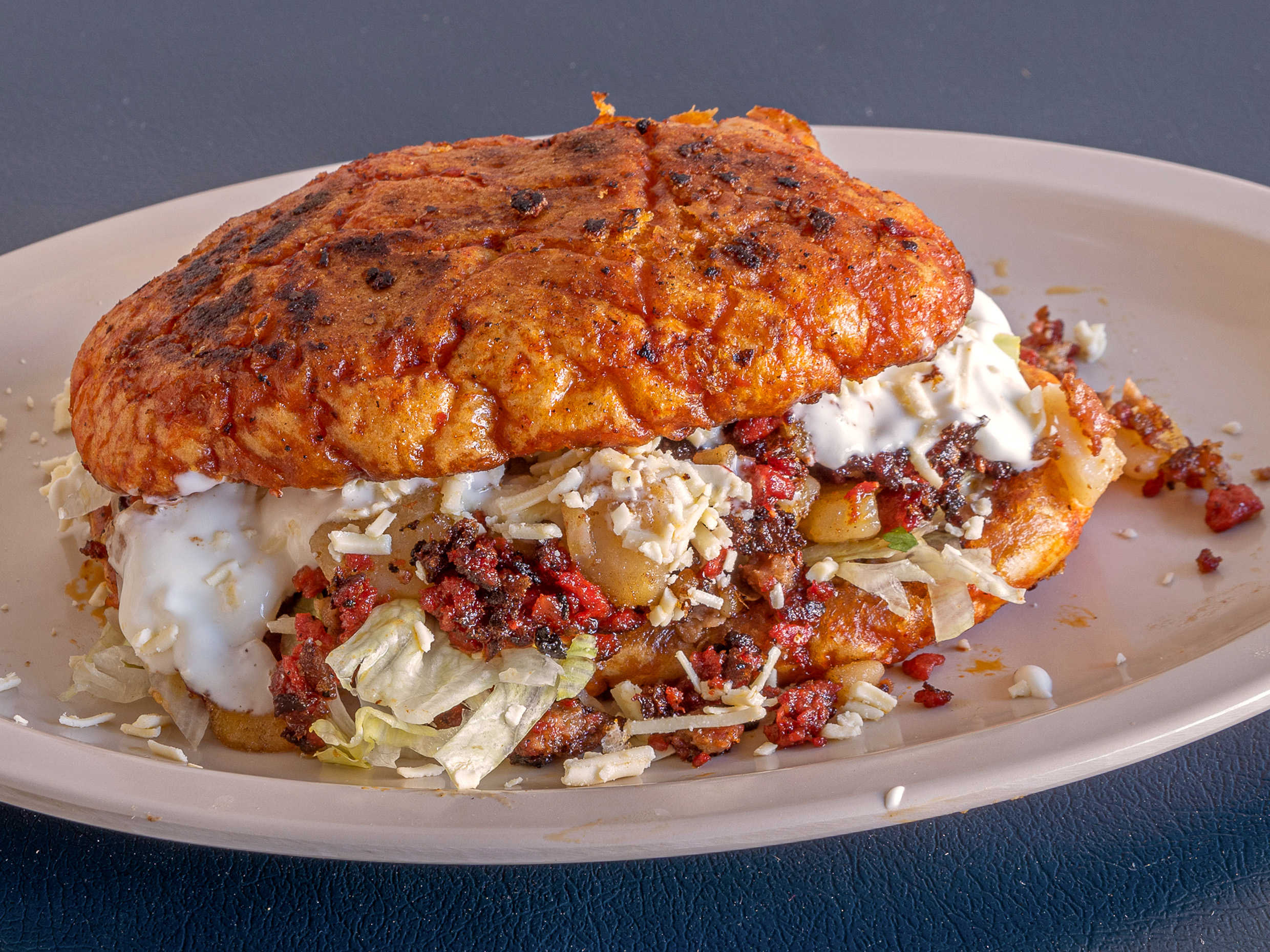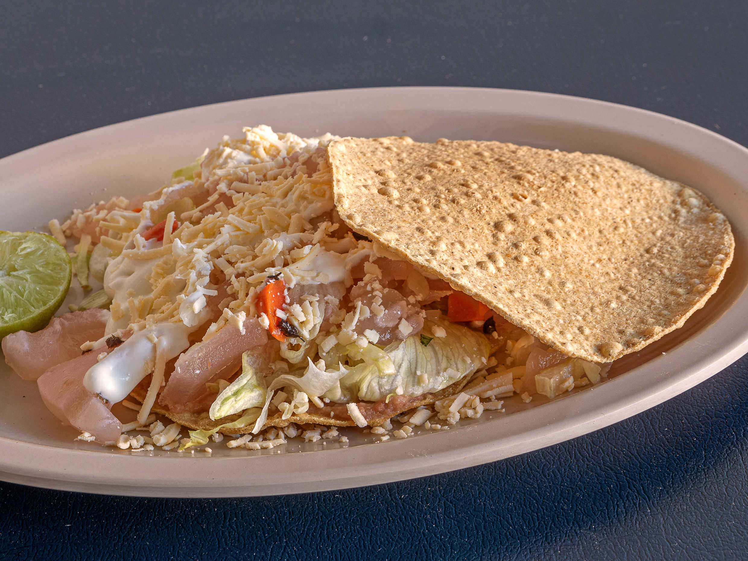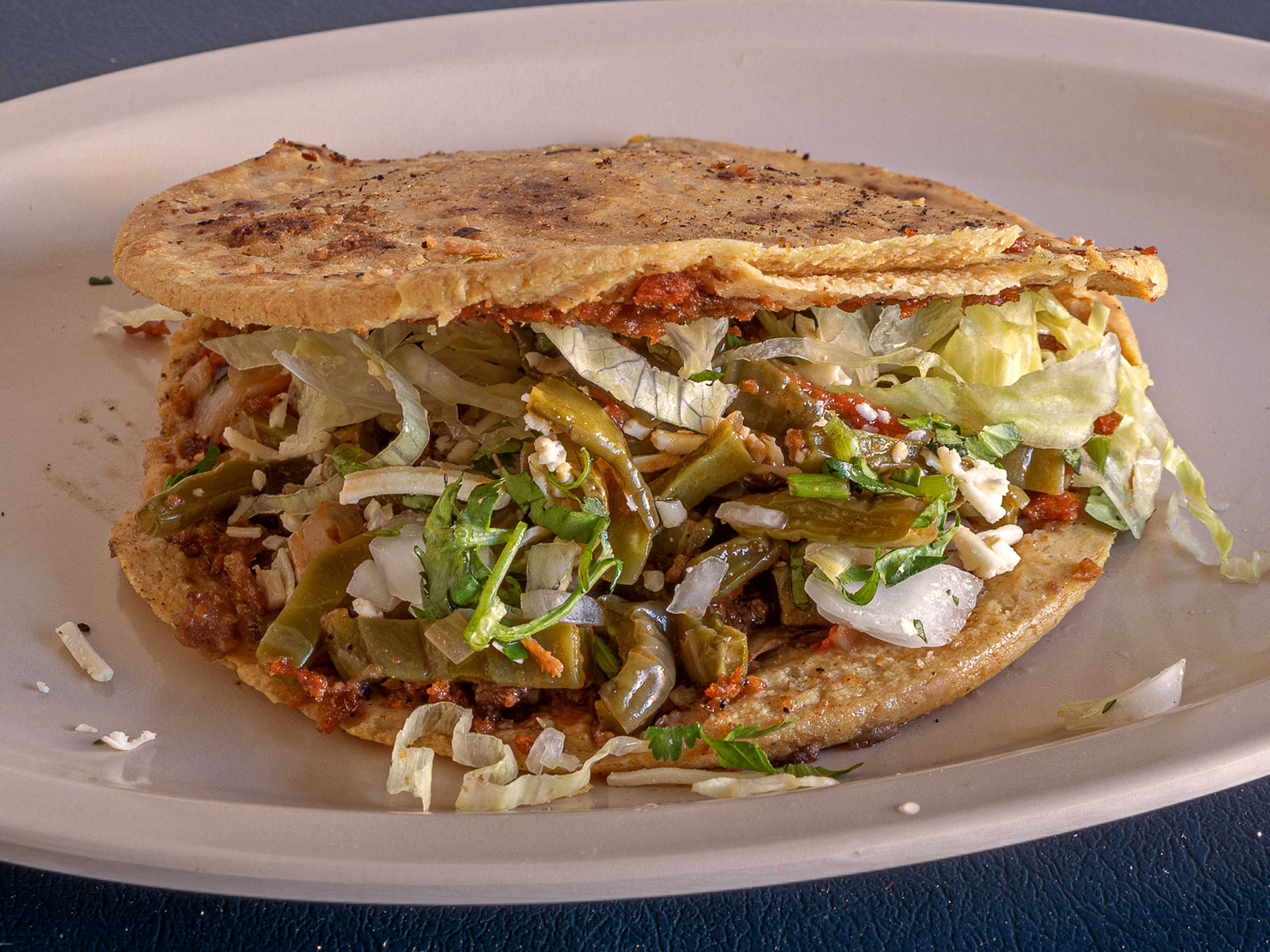 Bistec, chorizo, pollo asado o bistec adobado. Lleva frijoles, lechuga, crema y queso.