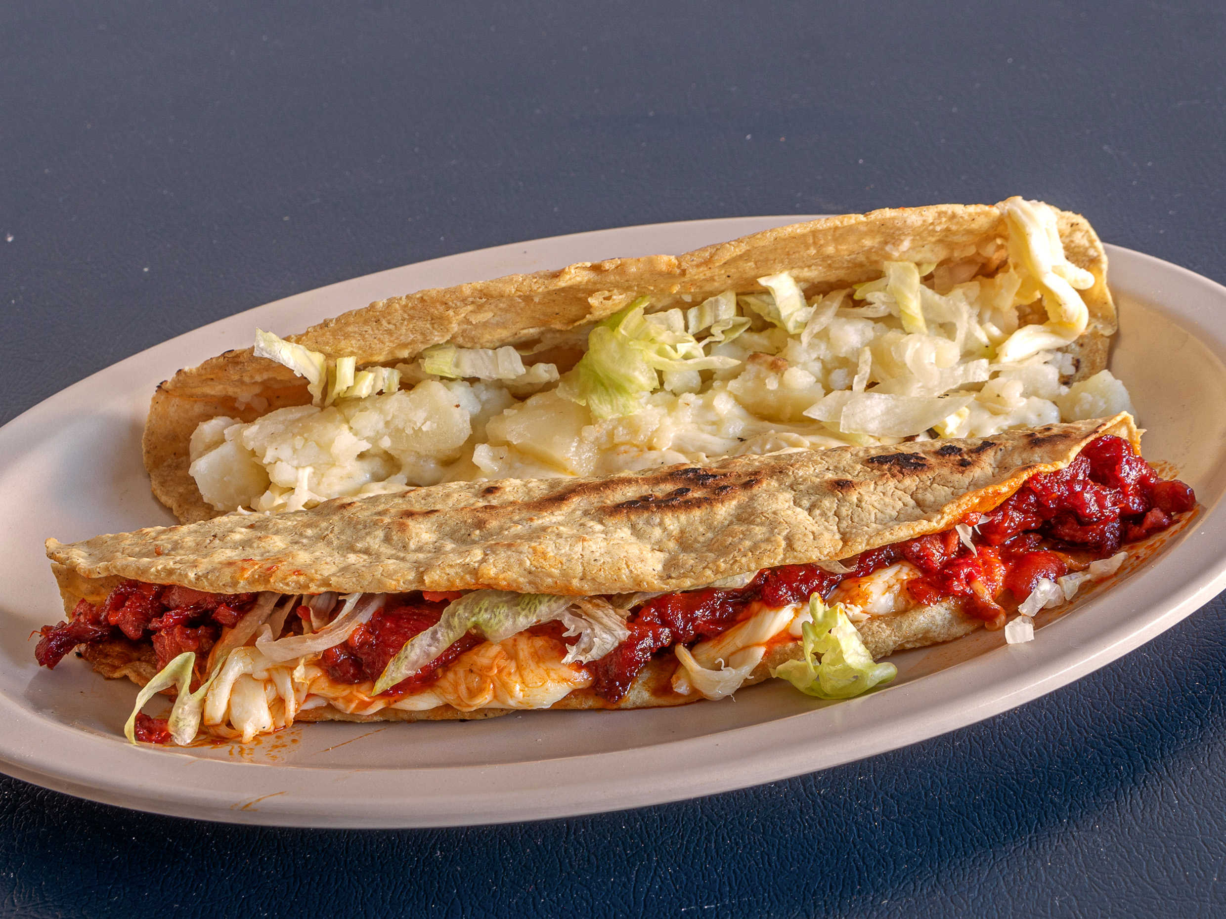 Papa, panza, queso, , picadillo, tinga de res, tinga de pollo, chicharrón prensado, papa con chorizo, mole rojo con pollo