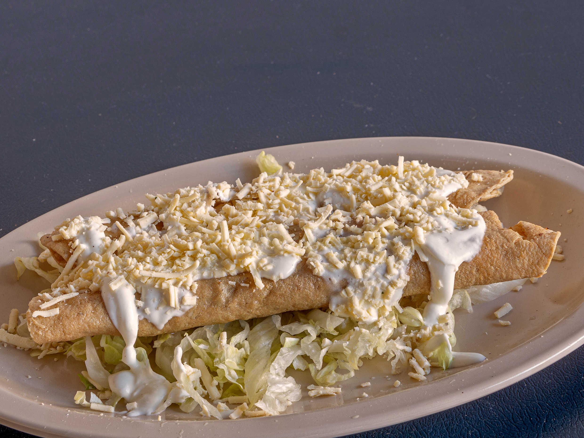 3 Piezas, rellenas de pollo, acompañadas con lechuga, crema, queso y frijoles.