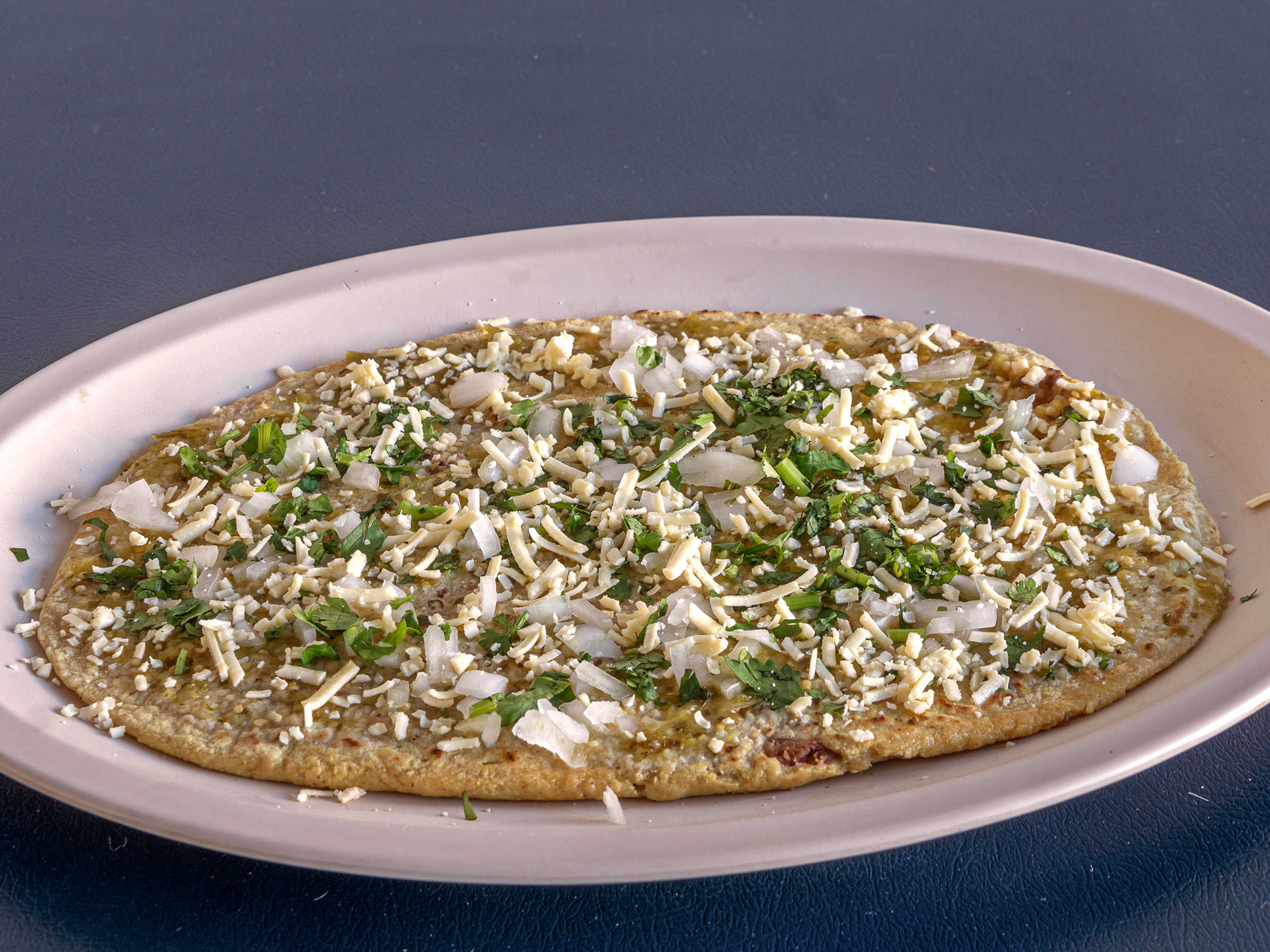 Frijol, salsa verde, cilantro, cebolla y queso rallado.