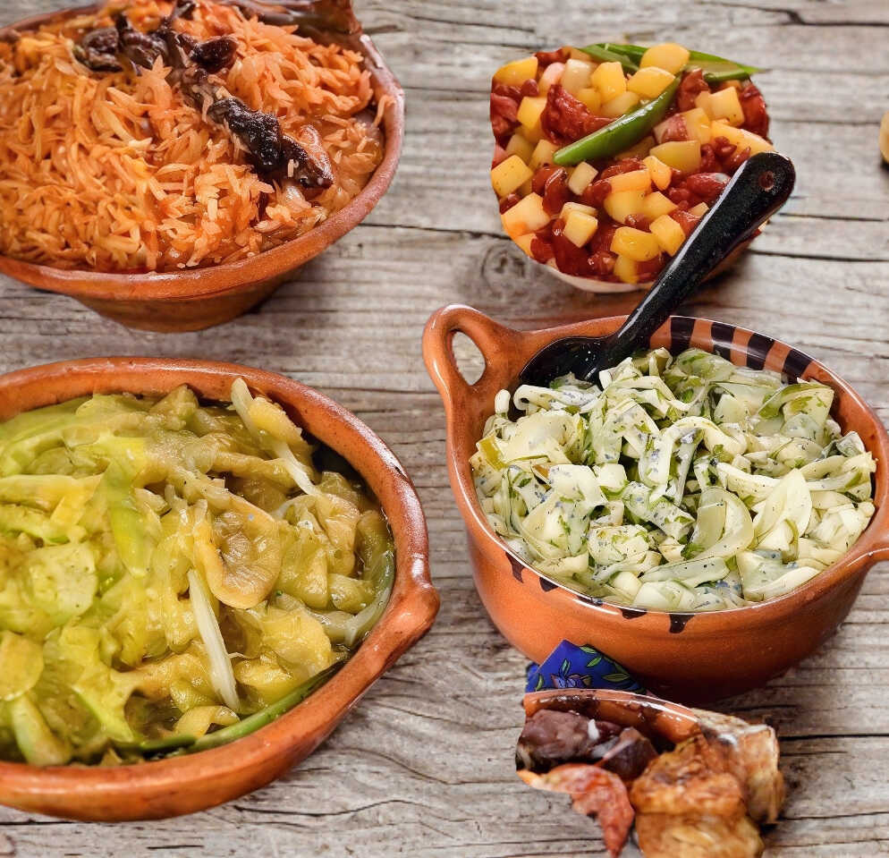 Ensalada, frijoles, papas y tortillas.