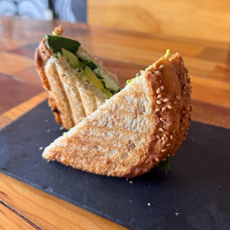 En pan integral de la casa, cebolla asada, champiñones, queso gratinado, lechuga, jitomate, aguacate, catsup, mostaza, mayonesa y chile jalapeño.