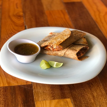 2 Tortillas de harina integral, con un toque de frijoles negros, relleno de pastor de soya, champiñones y queso asadero.