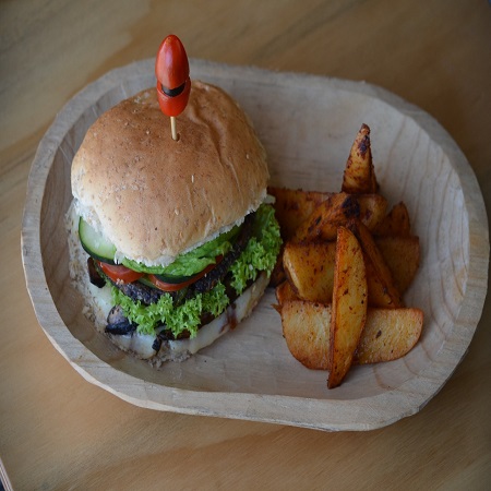 Carne de quinoa, frijol negro y amaranto, en pan vegano de la casa, con cebolla, pimiento asado, hongo portobello, queso gratinado, lechuga, jitomate, aguacate, pepino, catsup, mostaza y chile jalapeño, acompañada de papas gajo.