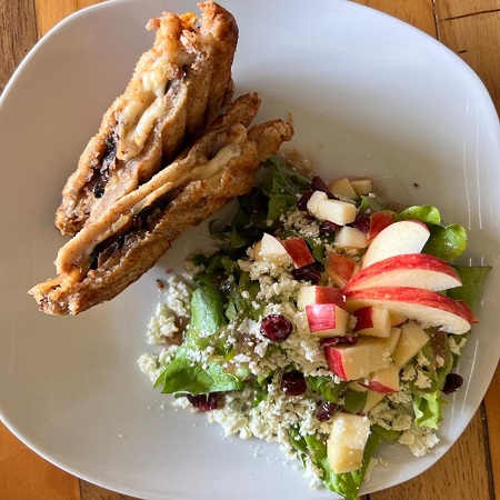 Mix de hortalizas, manzana roja, arandanos, queso panela y jitomate cherry con una vinagreta de naranja.