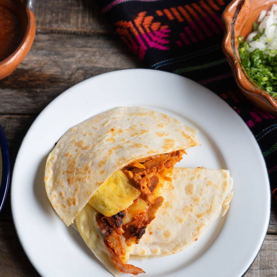 Salchicha, tocino, queso Oaxaca, jitomate, cebolla, chiles. Cátsup, mostaza y mayonesa.