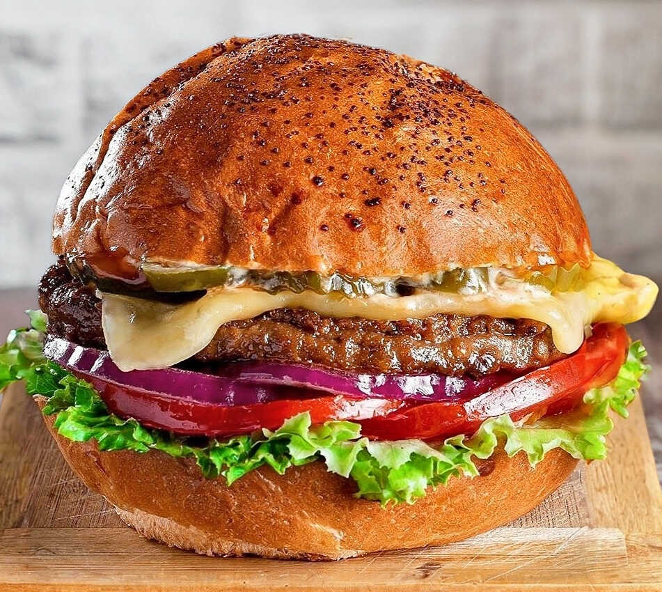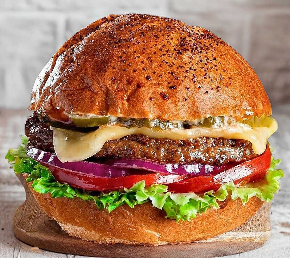 150 g de carne, queso americano, pan artesanal, mayonesa, mostaza, catsup, lechuga, jitomate, cebolla morada, jalapeño y pepinillos.
