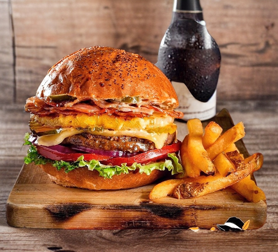 150 g de carne, queso americano, tocino ahumado, piña y un toque de BBQ o mango habanero (opcional)pan artesanal.