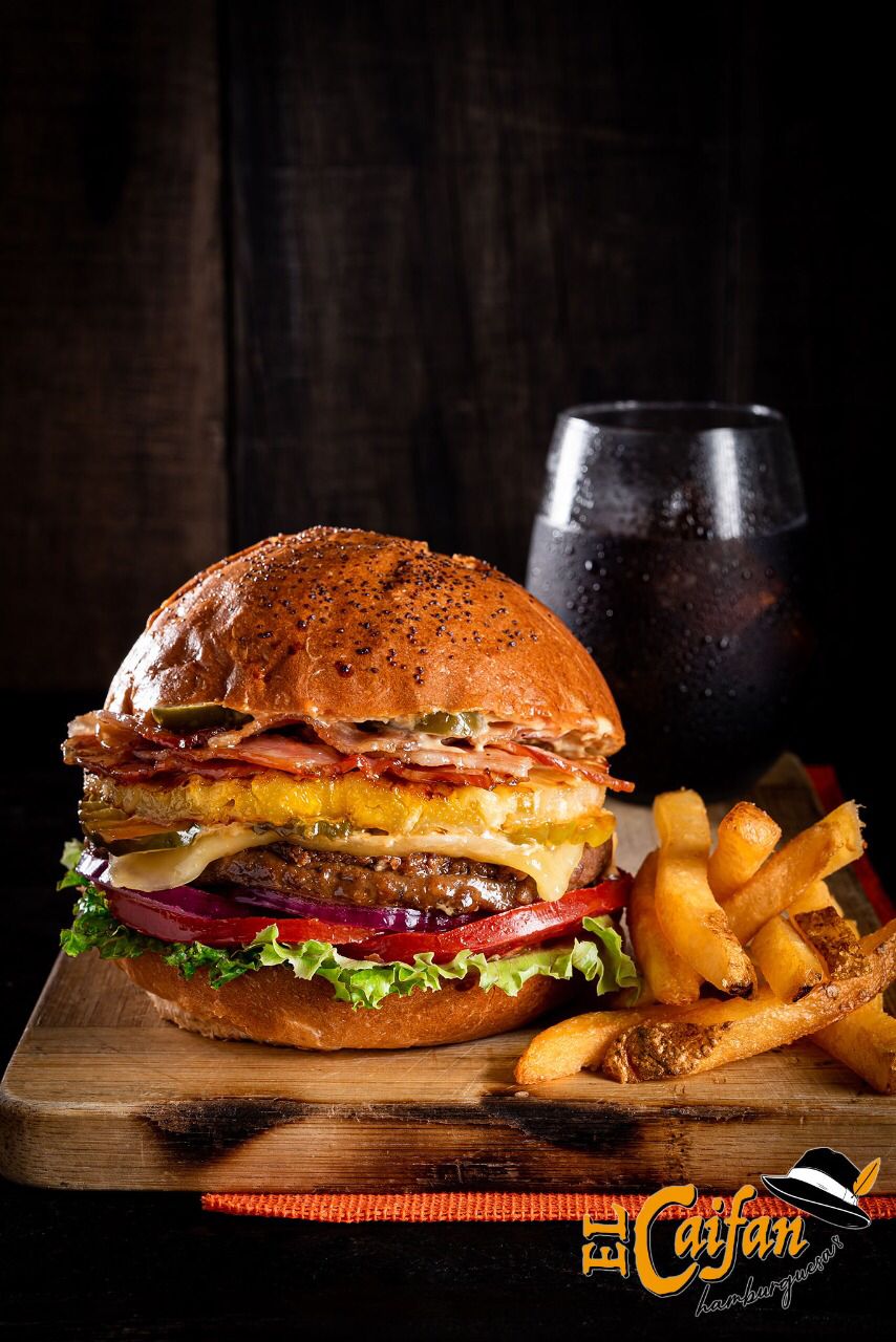 Doble carne de 150 g queso americano , queso gouda y pan artesanal.
