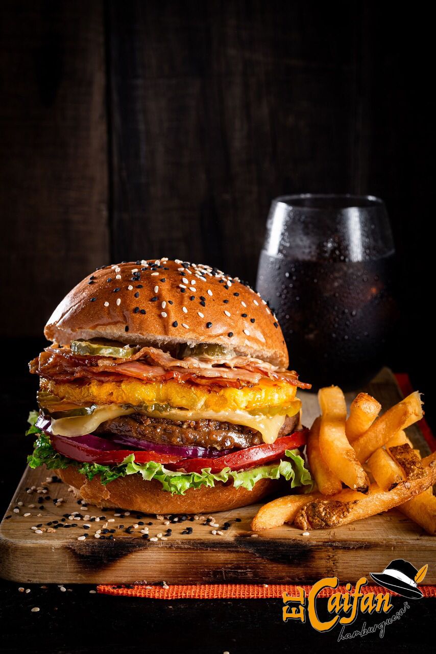 150 g de carne, queso americano, tocino, jamón ahumado, piña y un toque de BBQ o mango habanero (opcional).