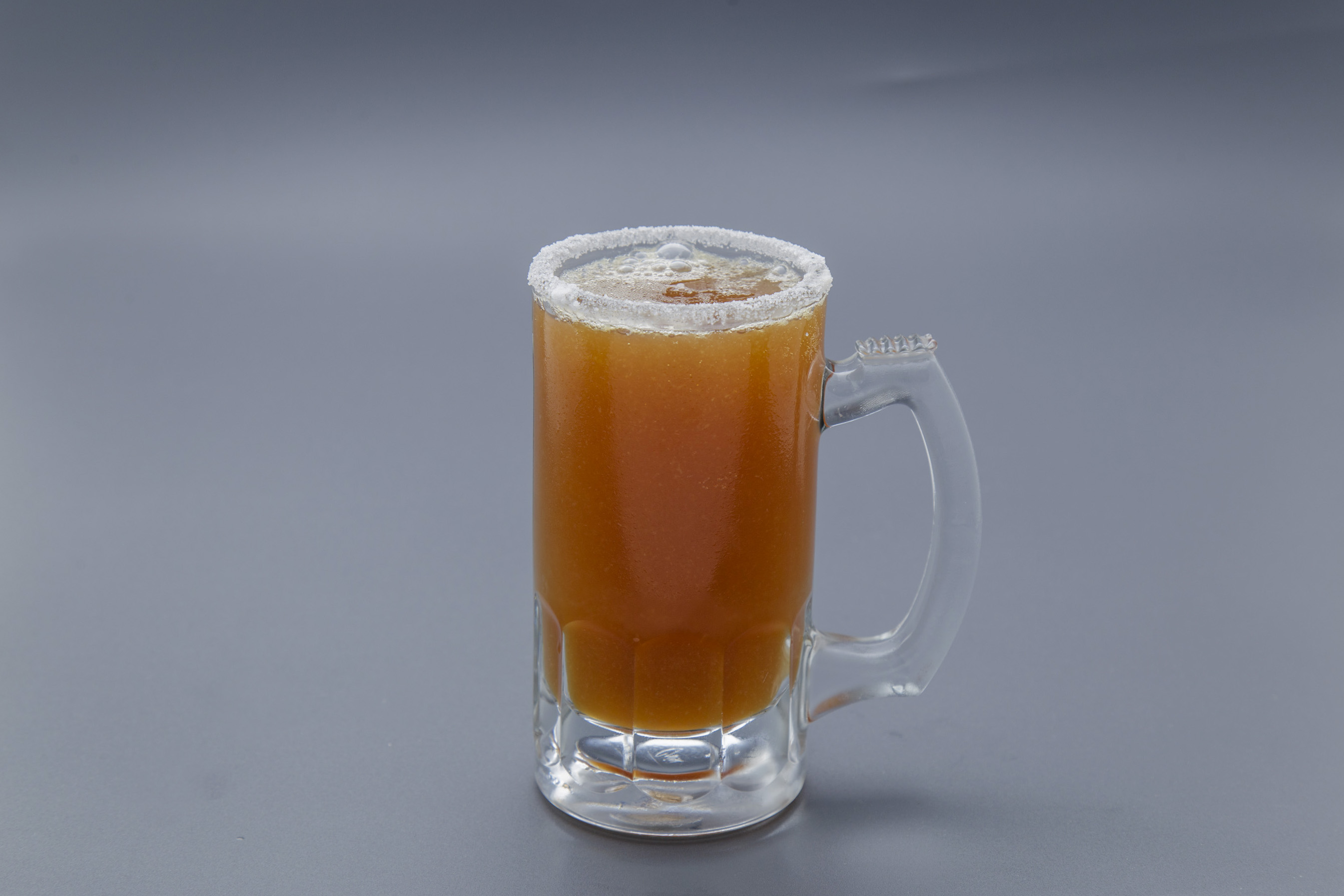 275 ml Jugo de tomate servido en un vaso con hielo, salsa inglesa, maggi y jugo de limón