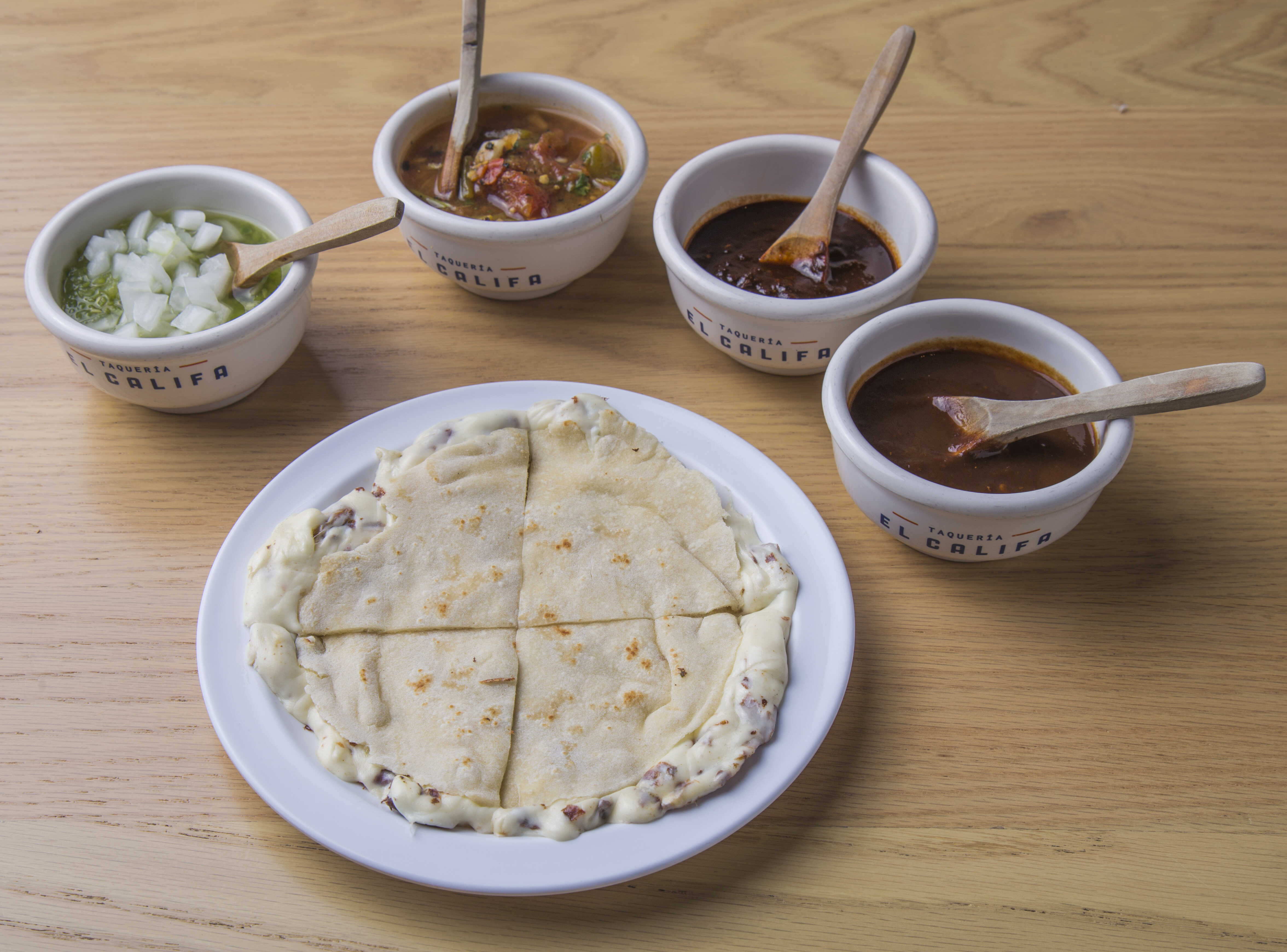 160 g Pan pita relleno de queso oaxaca gratinado sobre la plancha con rib eye picado