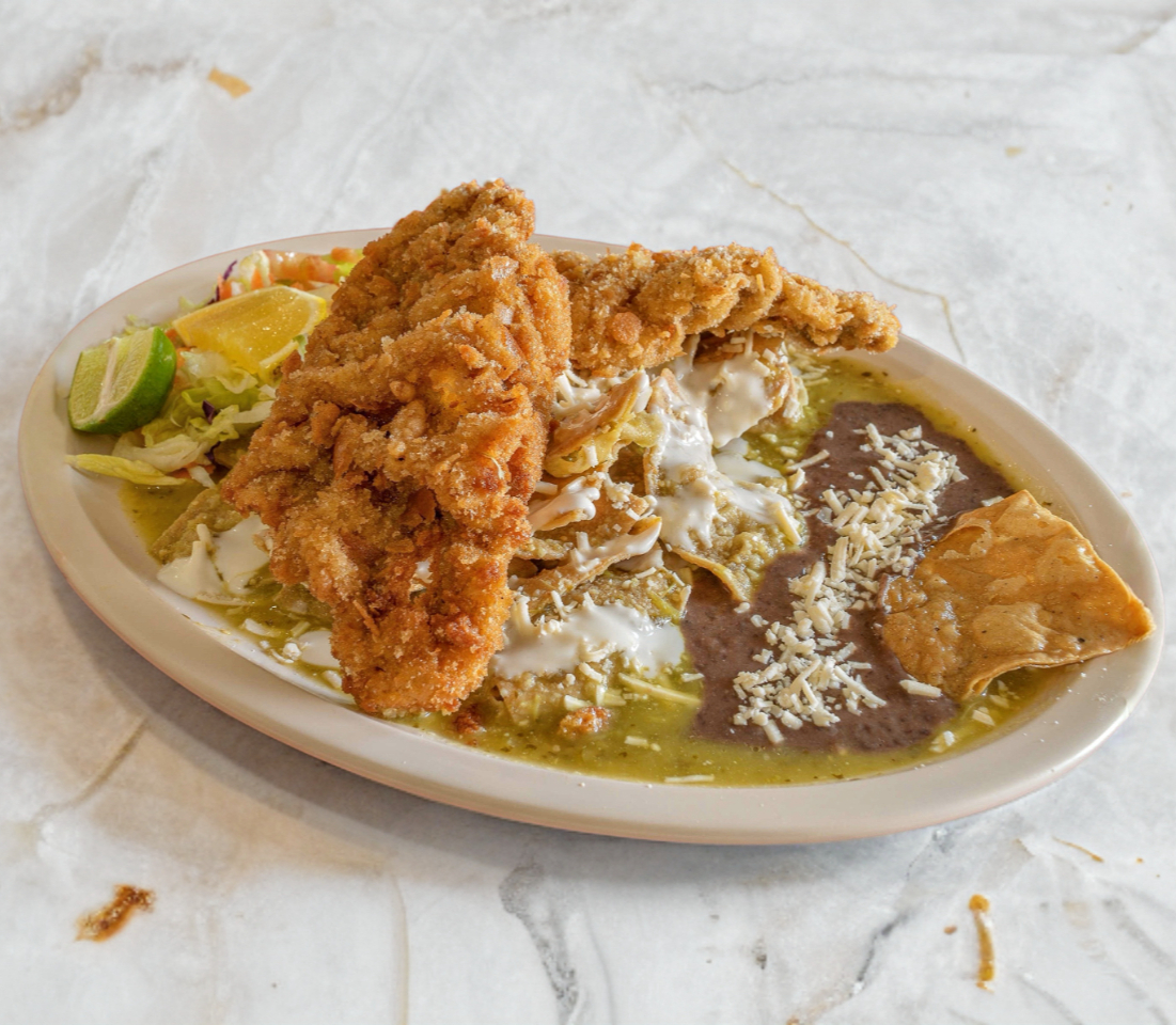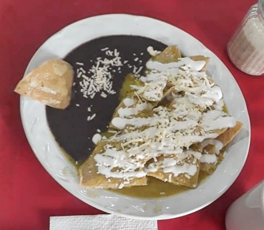 Chilaquiles verdes con huevo estrellados, bañados con crema y queso incluye café o té, fruta agua del día y un bolillo.