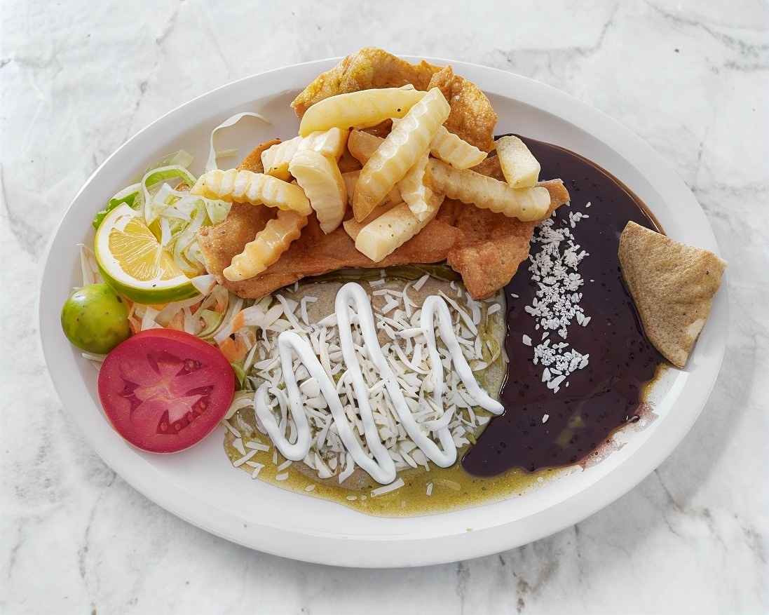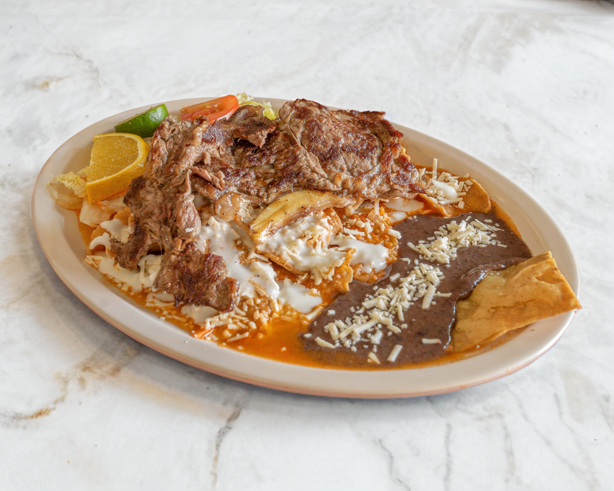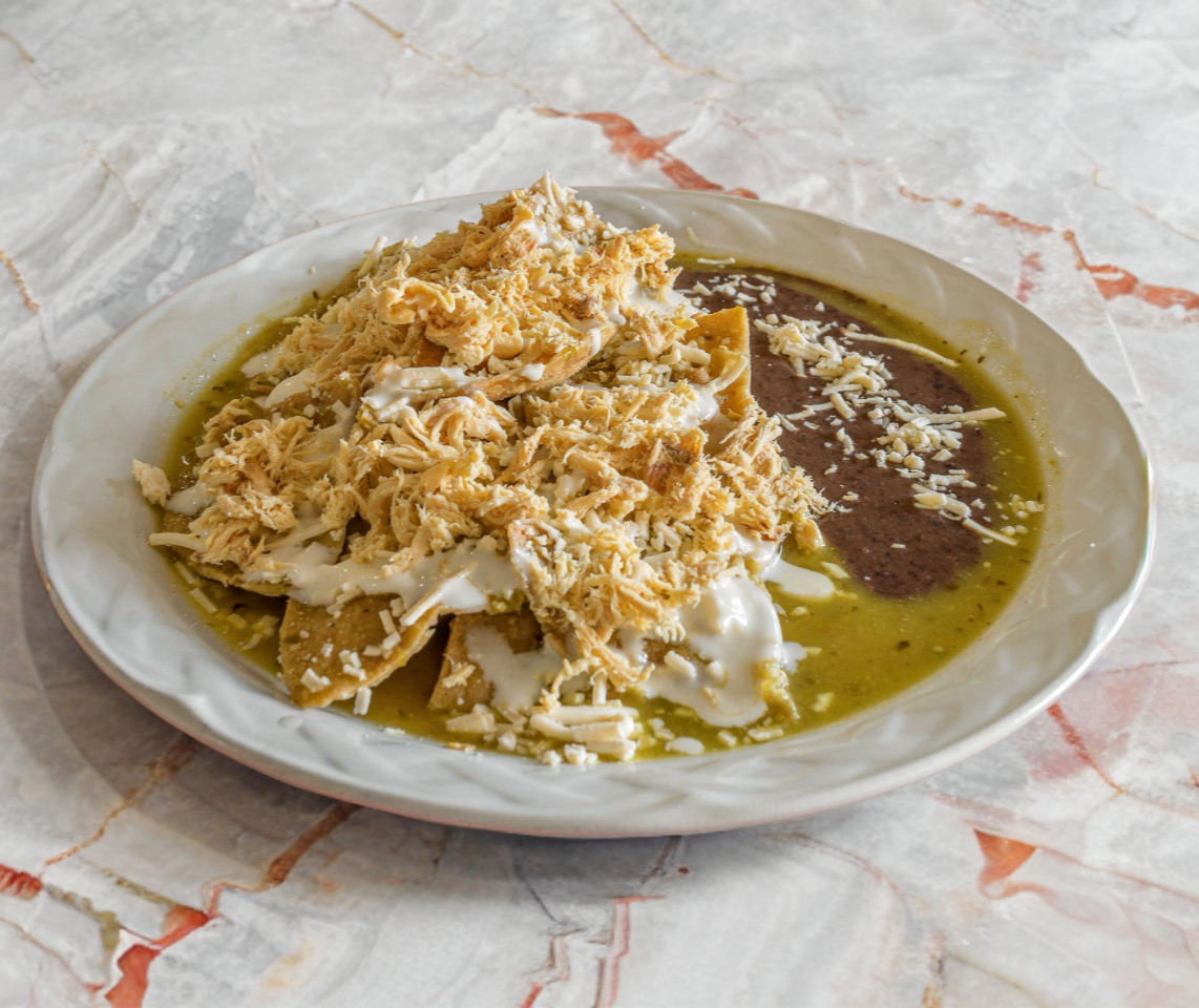 Chilaquiles contiene totopos de maíz con pollo deshebrado, salsa verde o roja, queso rallado y crema.