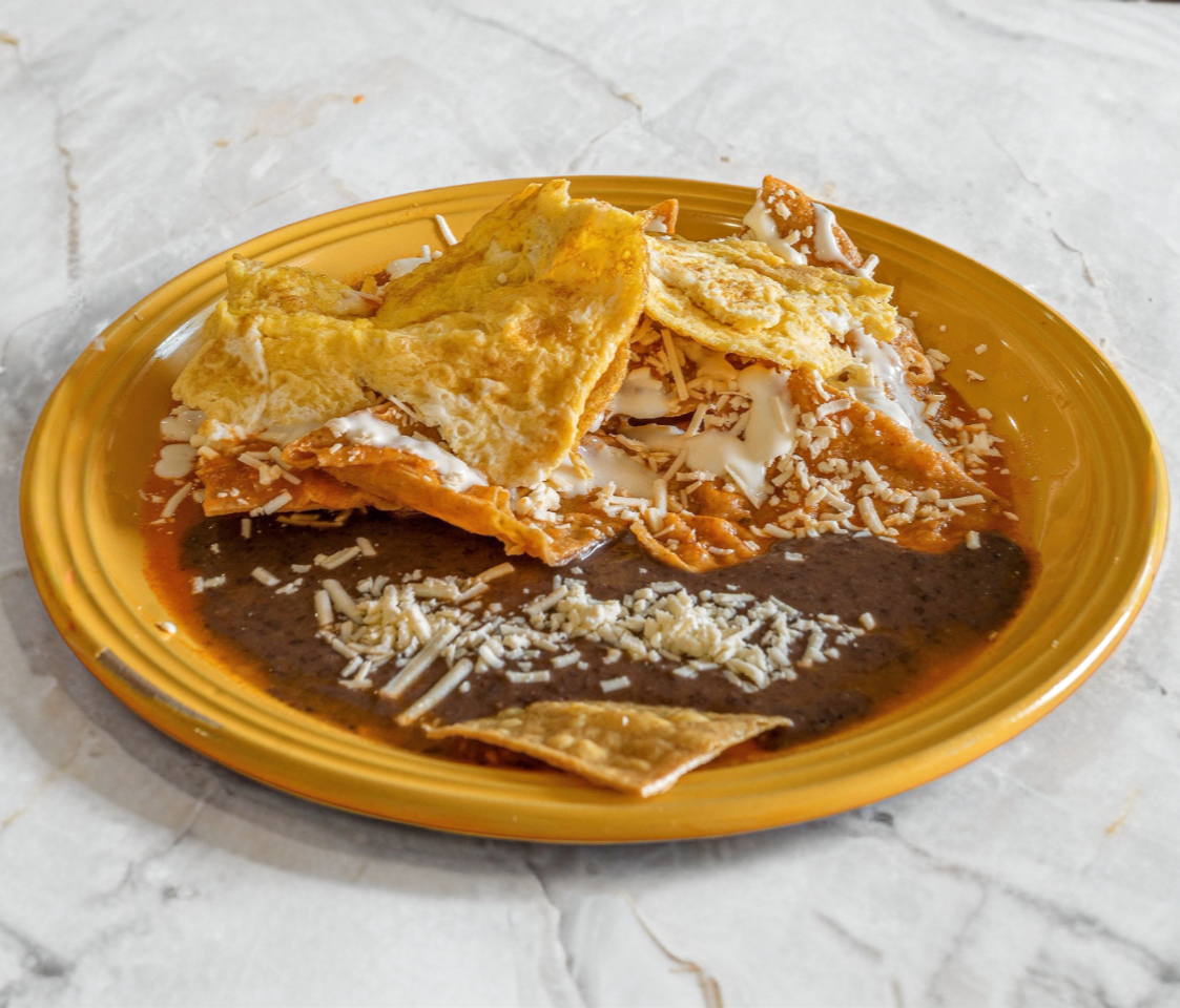 Chilaquiles en salsa roja bañados con crema, queso, huevo estrellado, incluye café o té, fruta, agua de sabor y un bolillo.