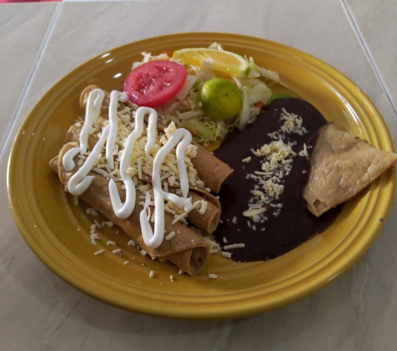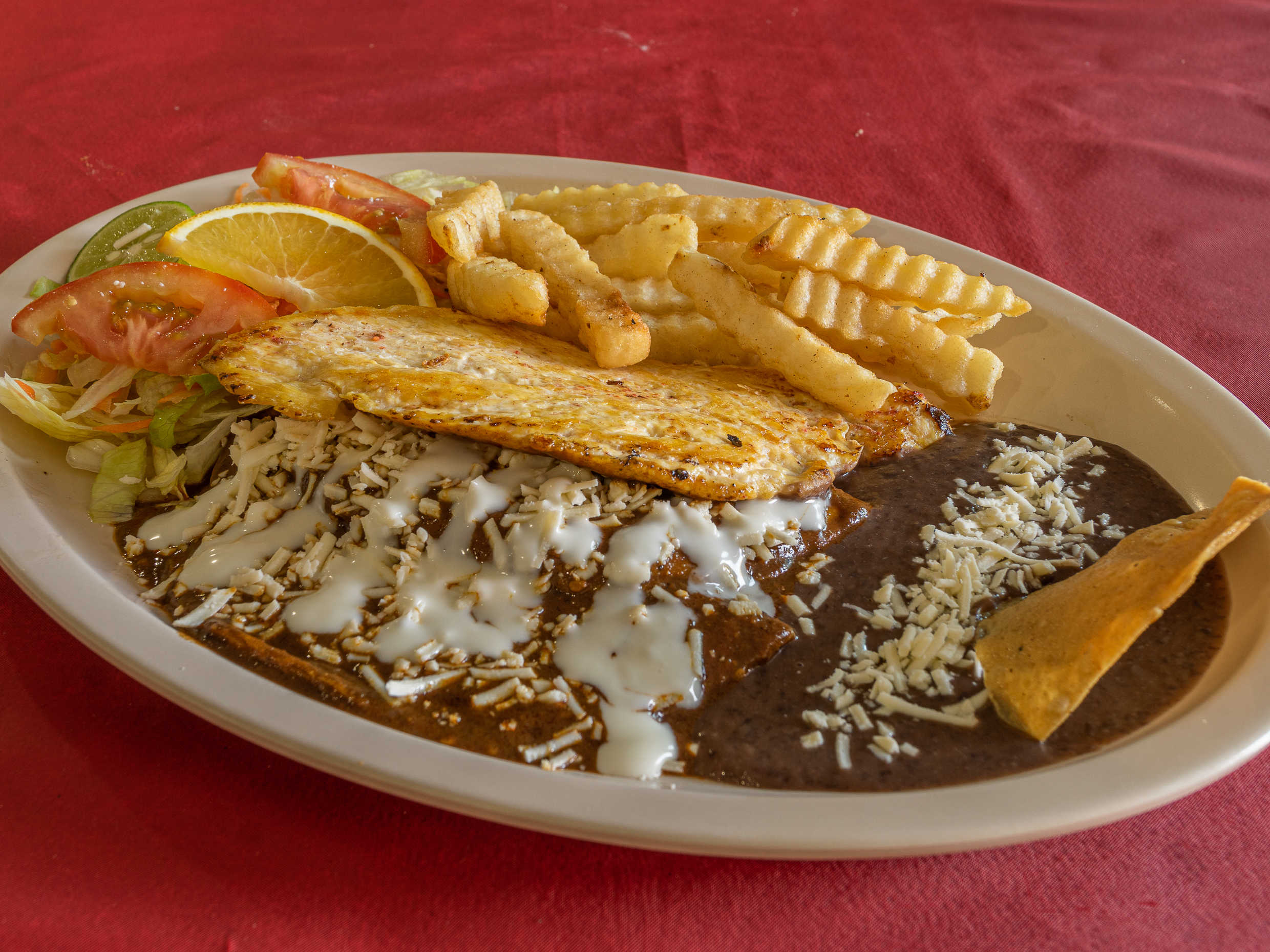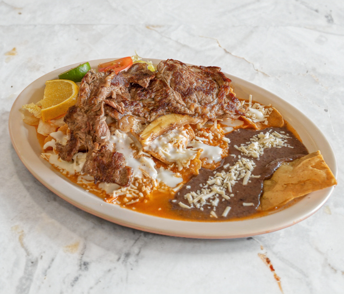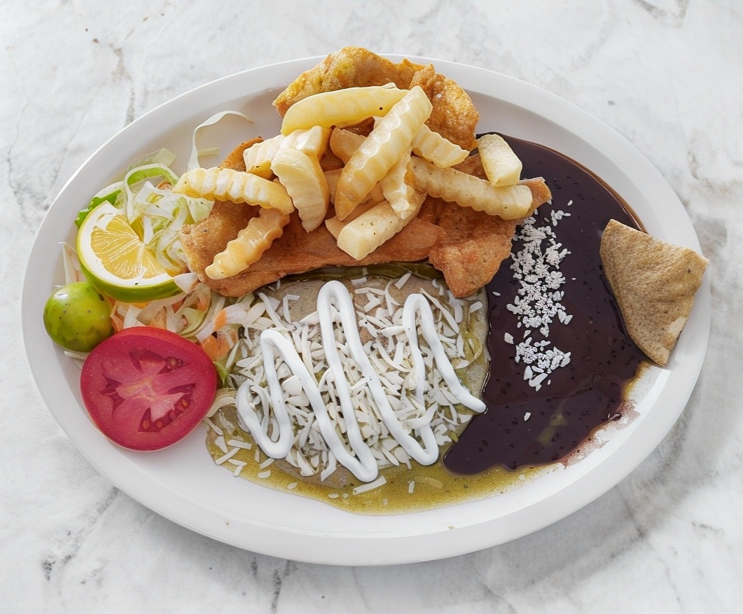 Res, pollo o puerco con ensalada, frijoles, papas a la francesa y dos enchiladas.