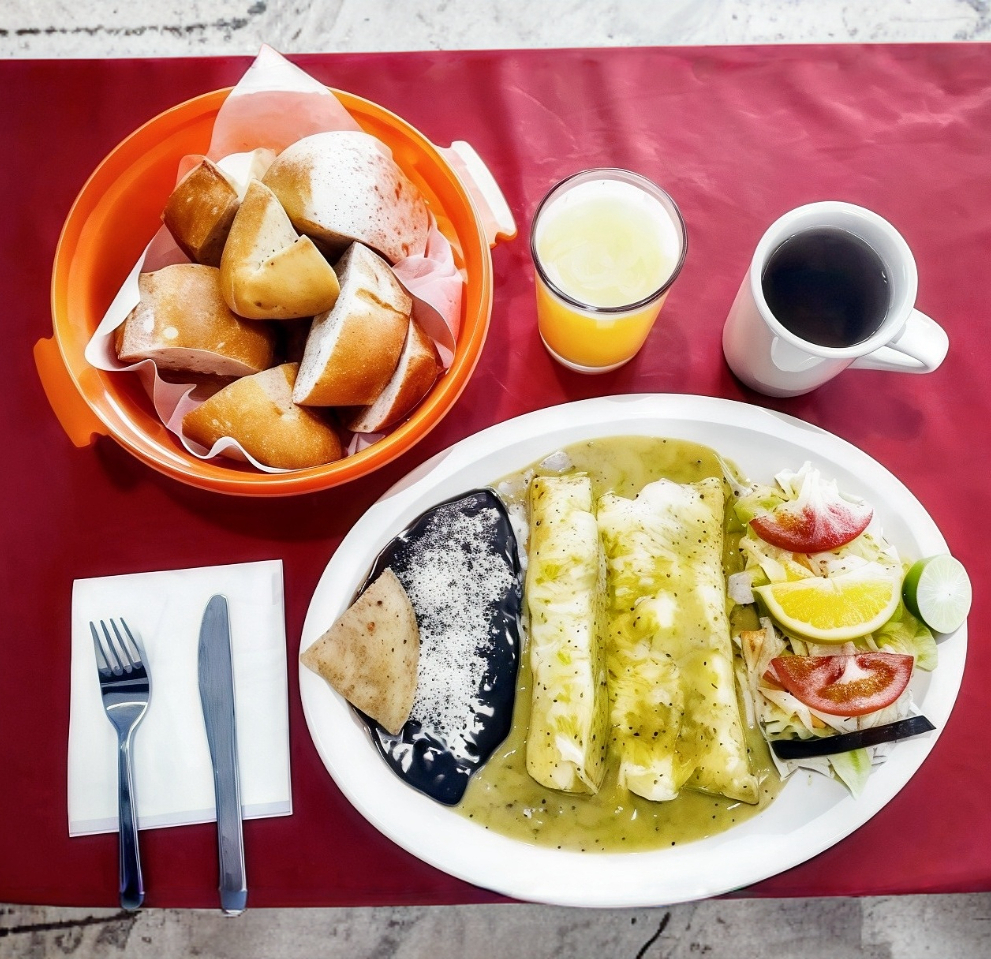 Rellenas de pollo o queso panela que incluye café o té, fruta, agua de sabor y un bolillo.