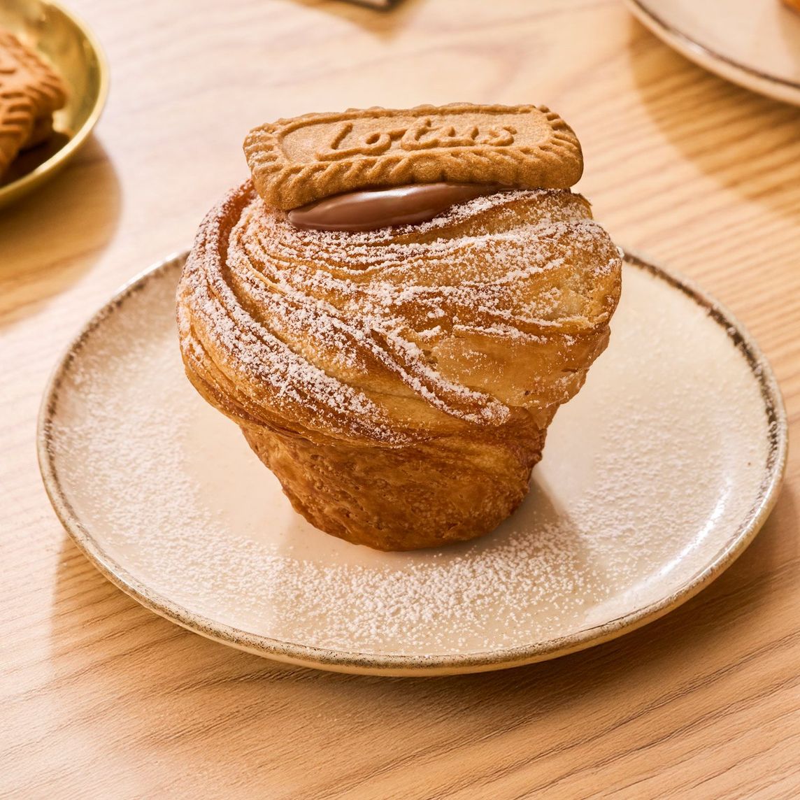 La mezcla perfecta de pan dulce que combina la masa de croissant y la forma de un muffin, con sabor intenso a mantequilla, textura crujiente y relleno con una deliciosa crema de caramelo y chocolate de leche. Decorado con una galleta de Lotus