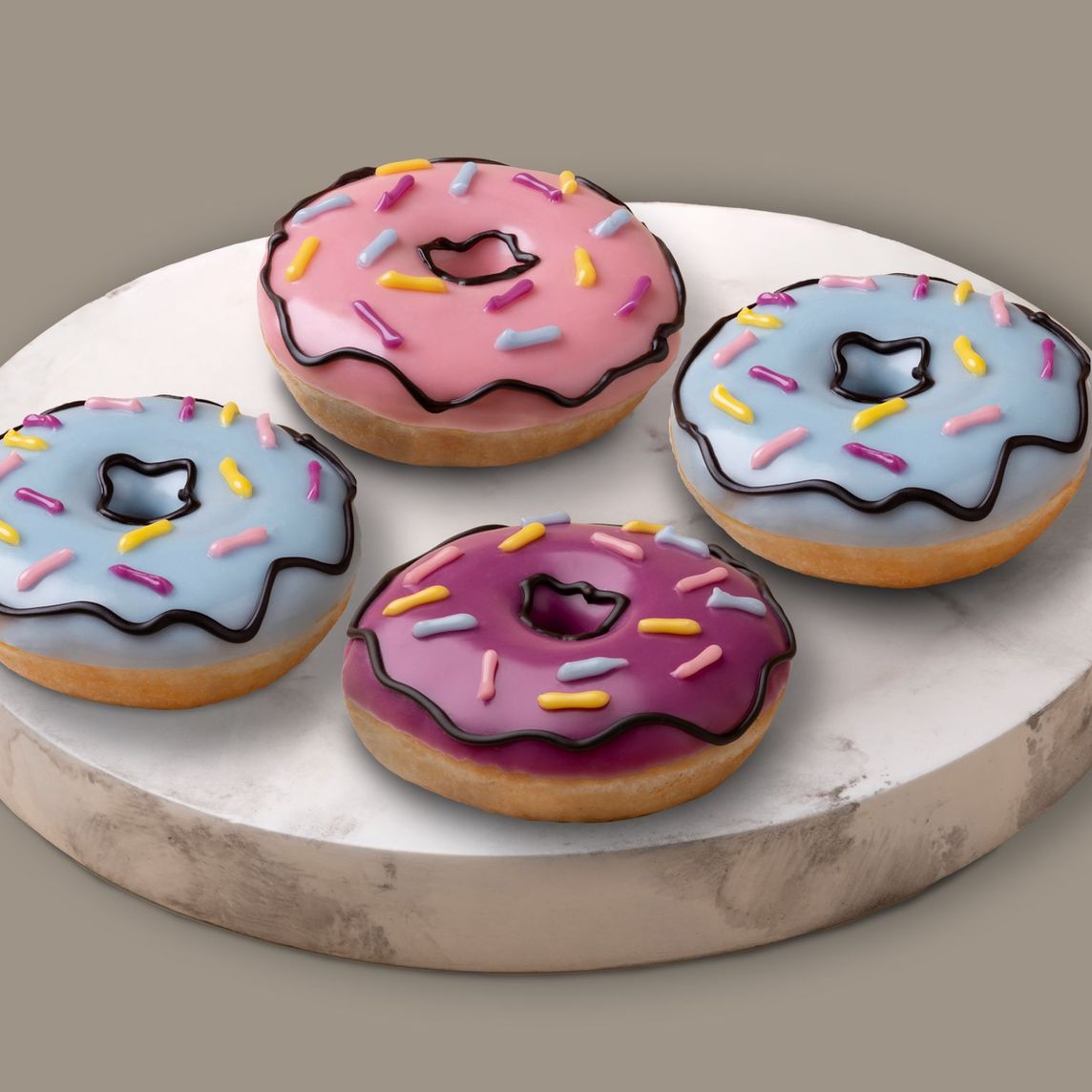 Tu dosis perfecta de dulzura. Cuatro donas caricatura con ese toque divertido que hace todo mejor.