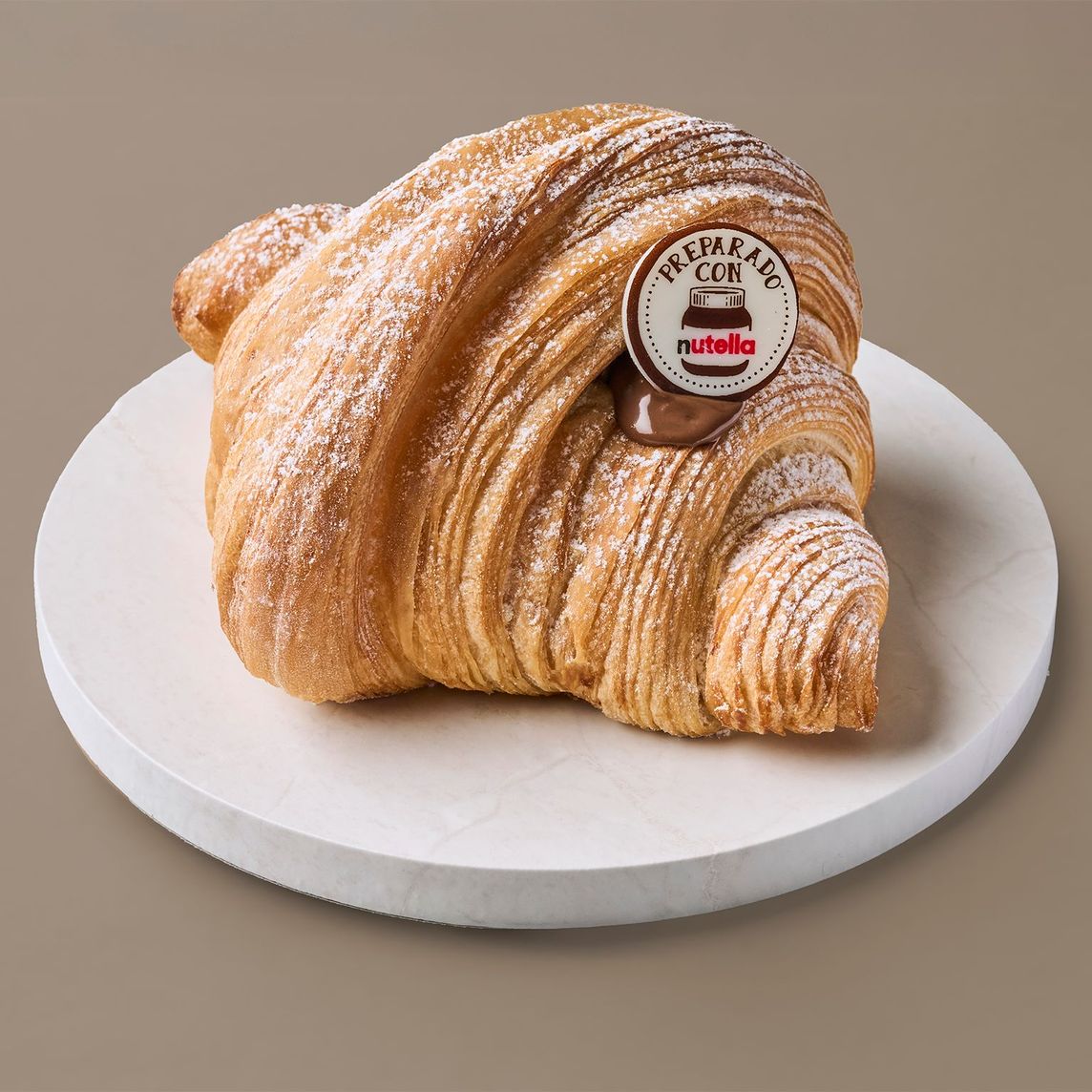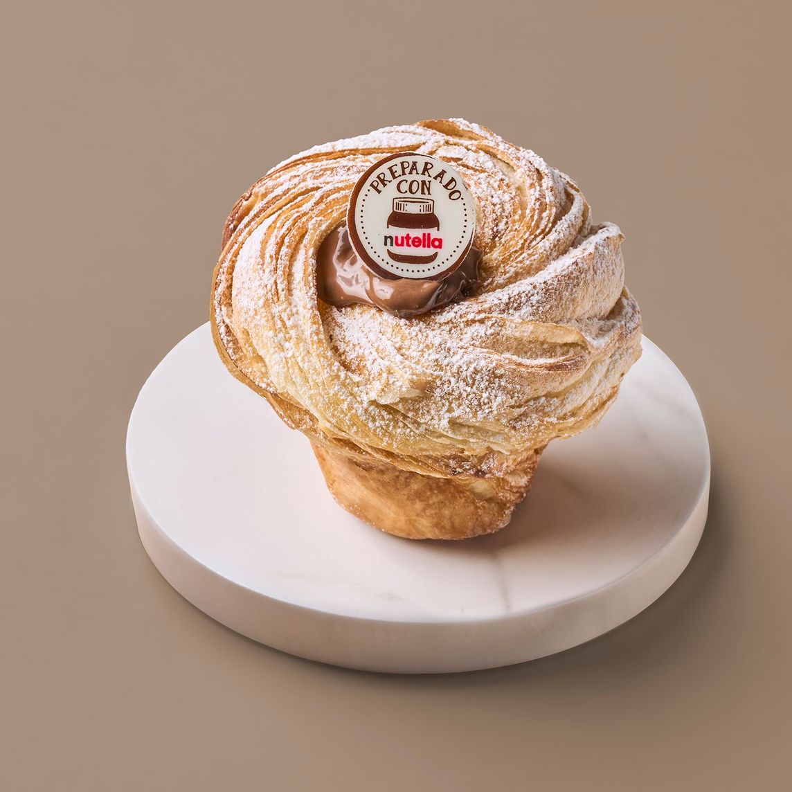 Pan dulce hibrido que combina la masa de croissant y la forma de un muffin. El sabor de la masa es intenso a mantequilla y su textura crujiente por fuera y suave por dentro. Relleno con Nutella y decorado con una placa sabor a chocolate blanco.