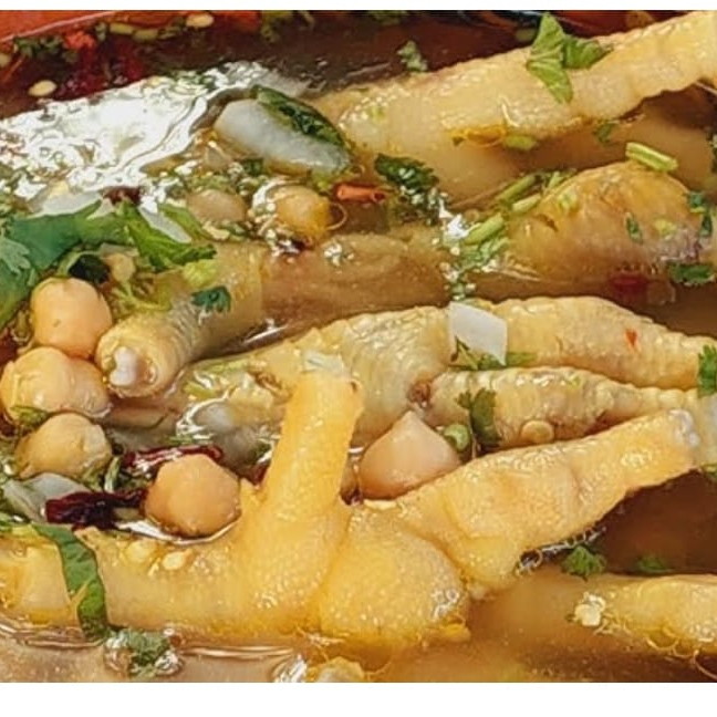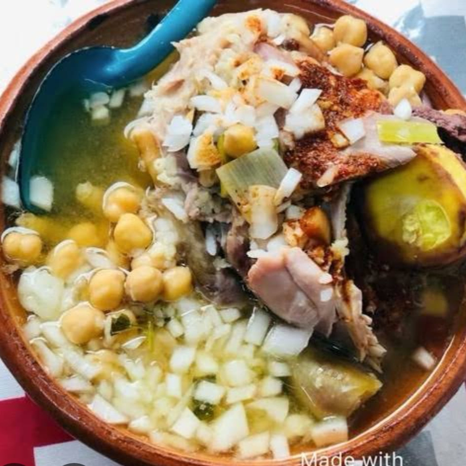 Caldo tradicional con patas de gallina, cebolla, cilantro, salsa macha, chile en polvo y limón.
