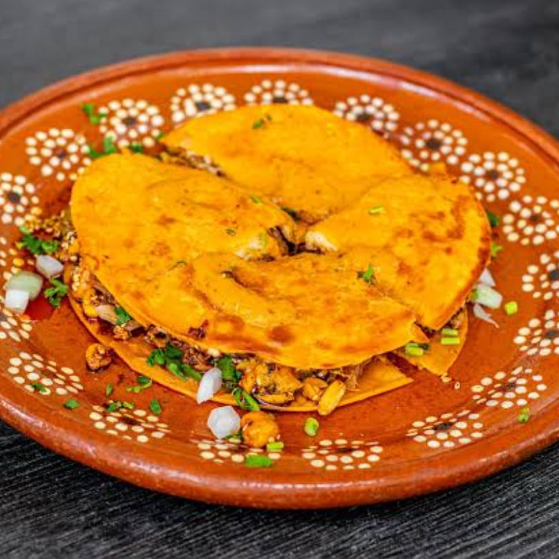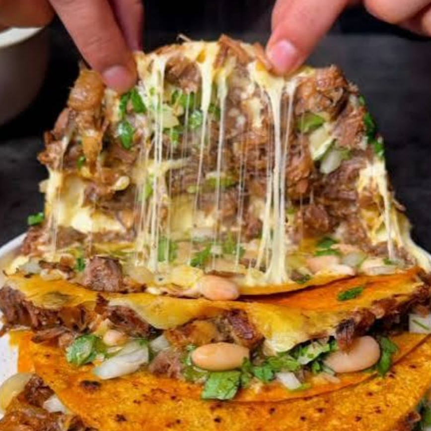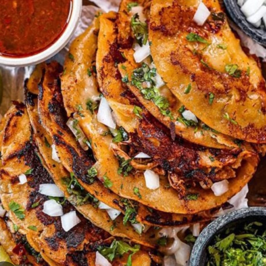Tortillas con birria, queso fundido, cebolla, cilantro, salsa y limón.