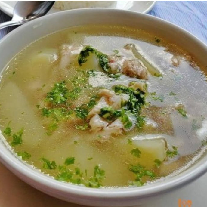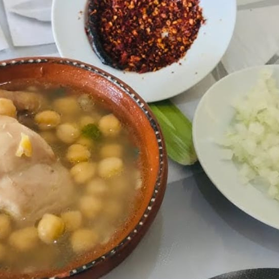 Caldo abundante con media pechuga, cebolla, cilantro, salsa macha, chile en polvo y limón.
