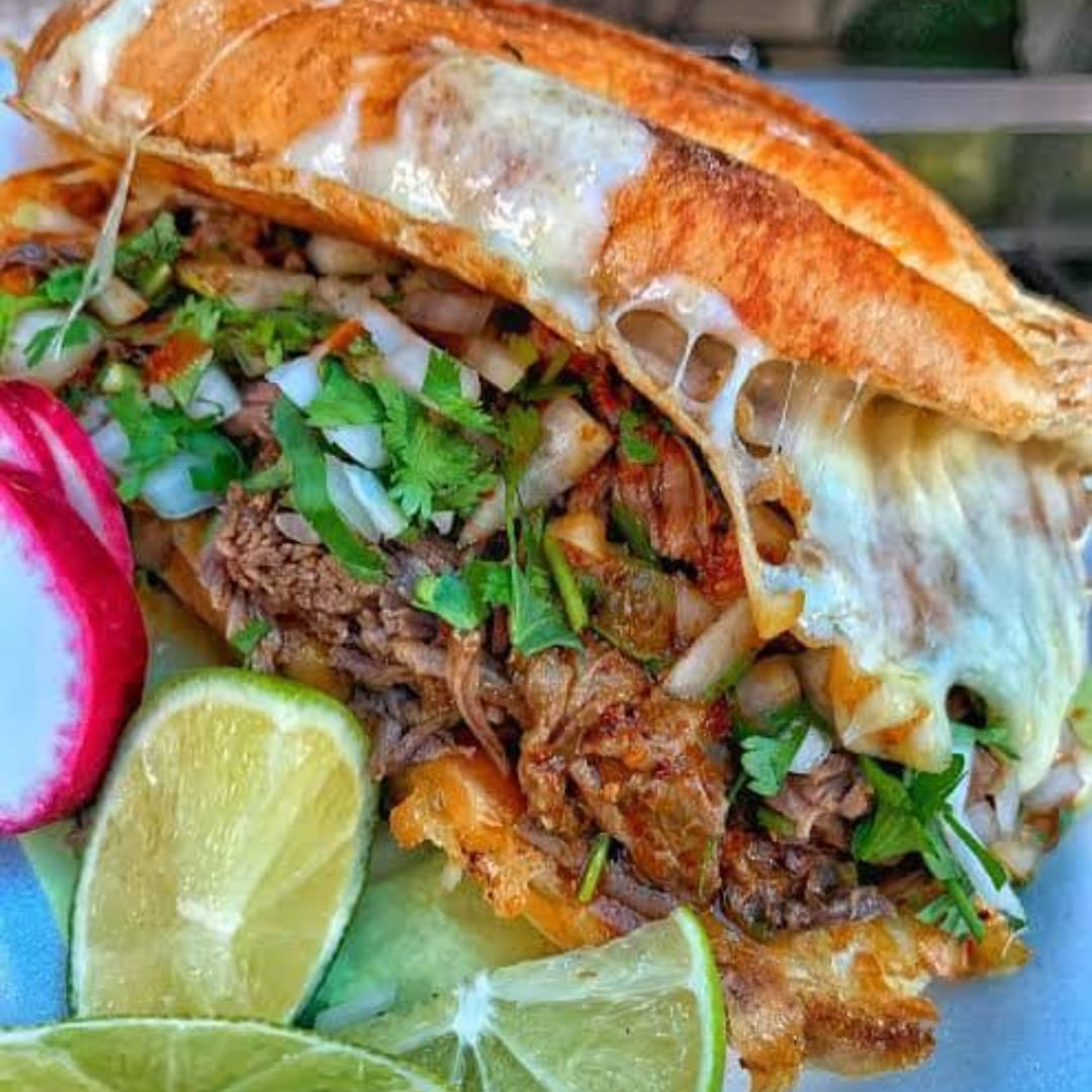 Torta con birria, queso Oaxaca, cebolla, cilantro, salsa y limón.