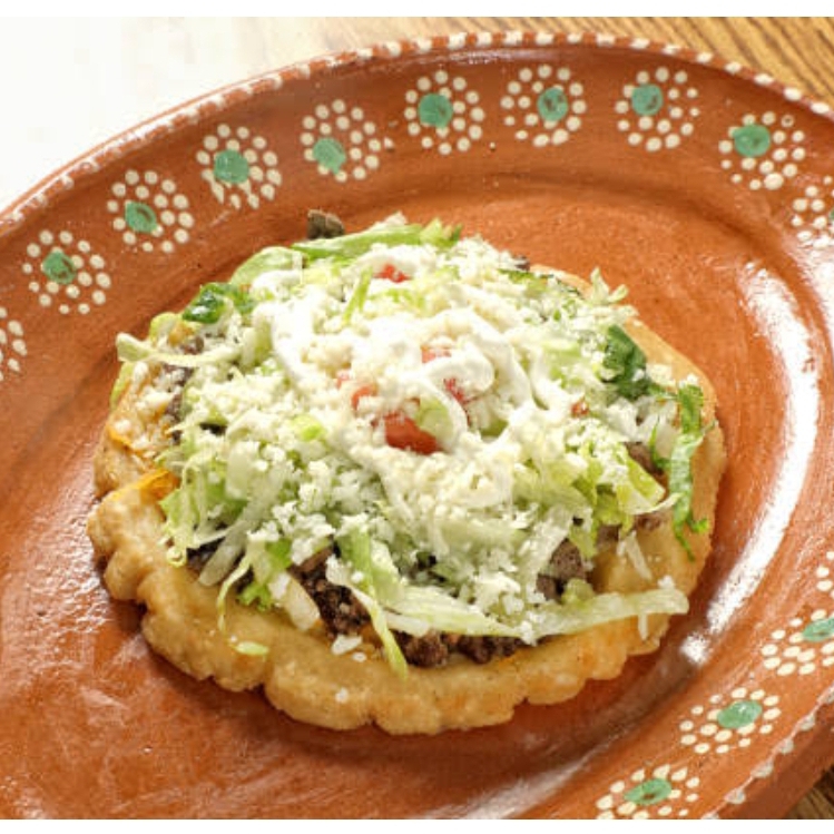 Sopes con frijoles refritos, lechuga, pollo, queso y salsa.