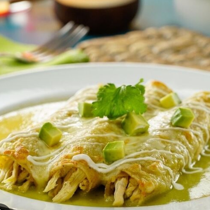 Enchiladas de pollo bañadas en salsa verde con cebolla, cilantro, queso, crema y bolillo.