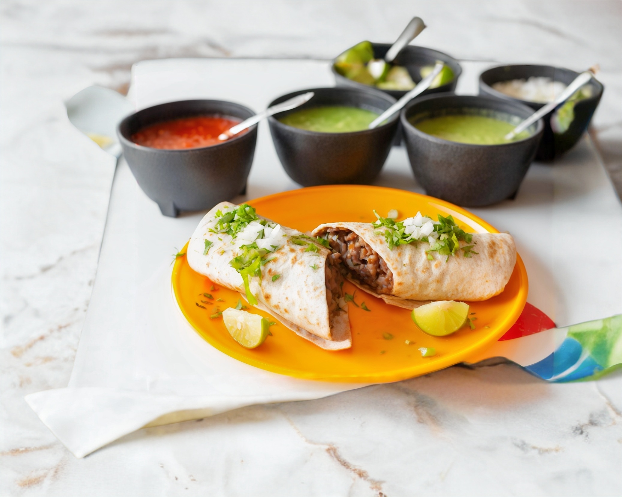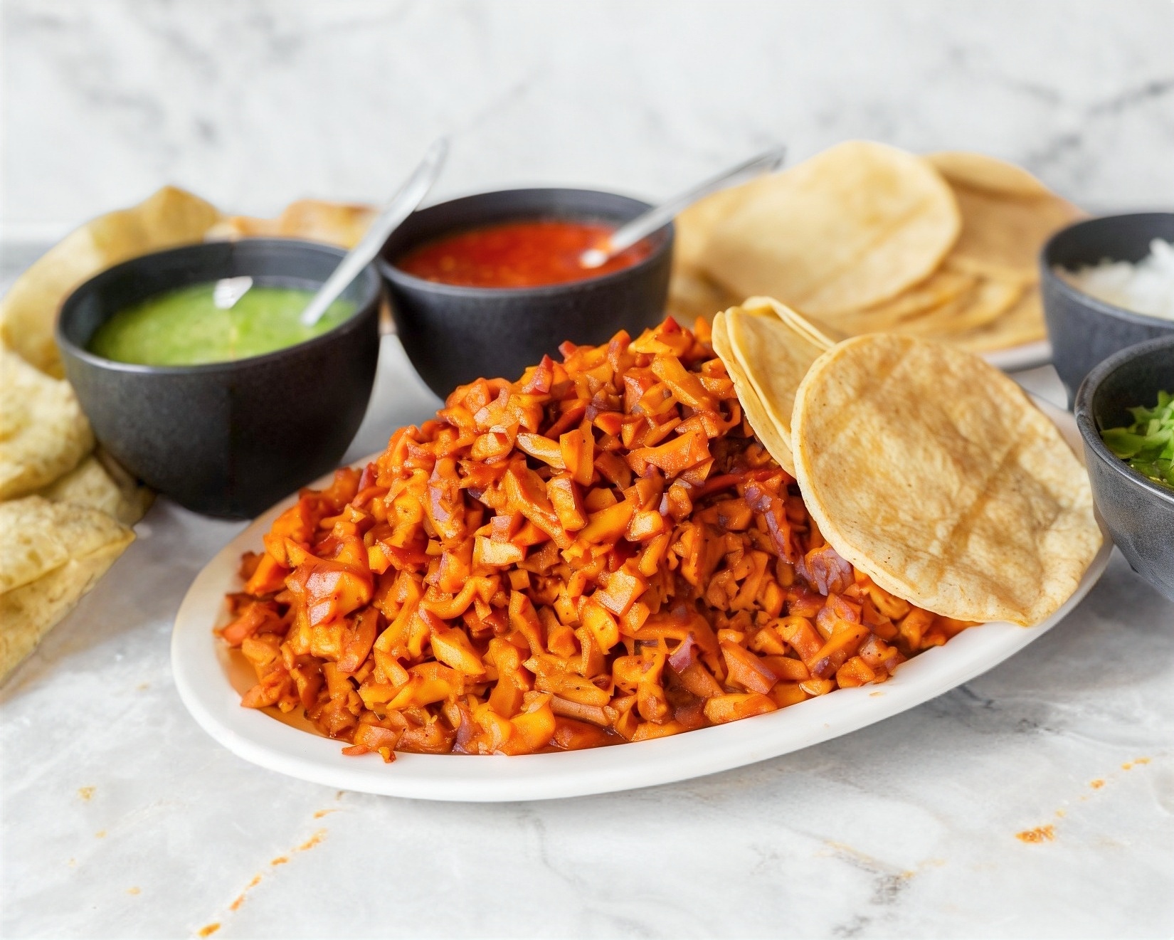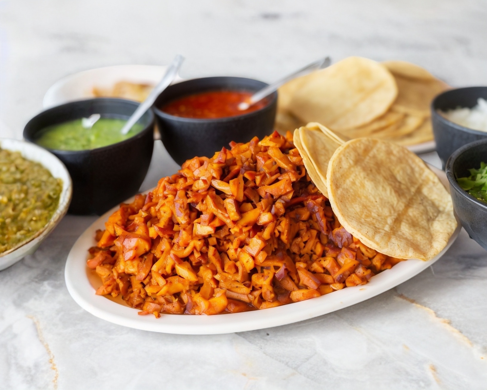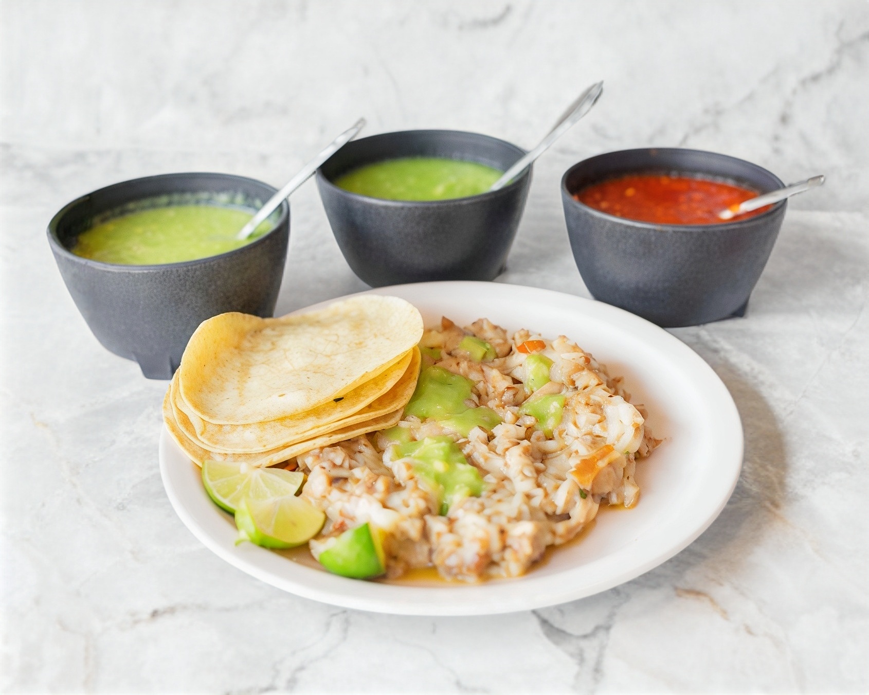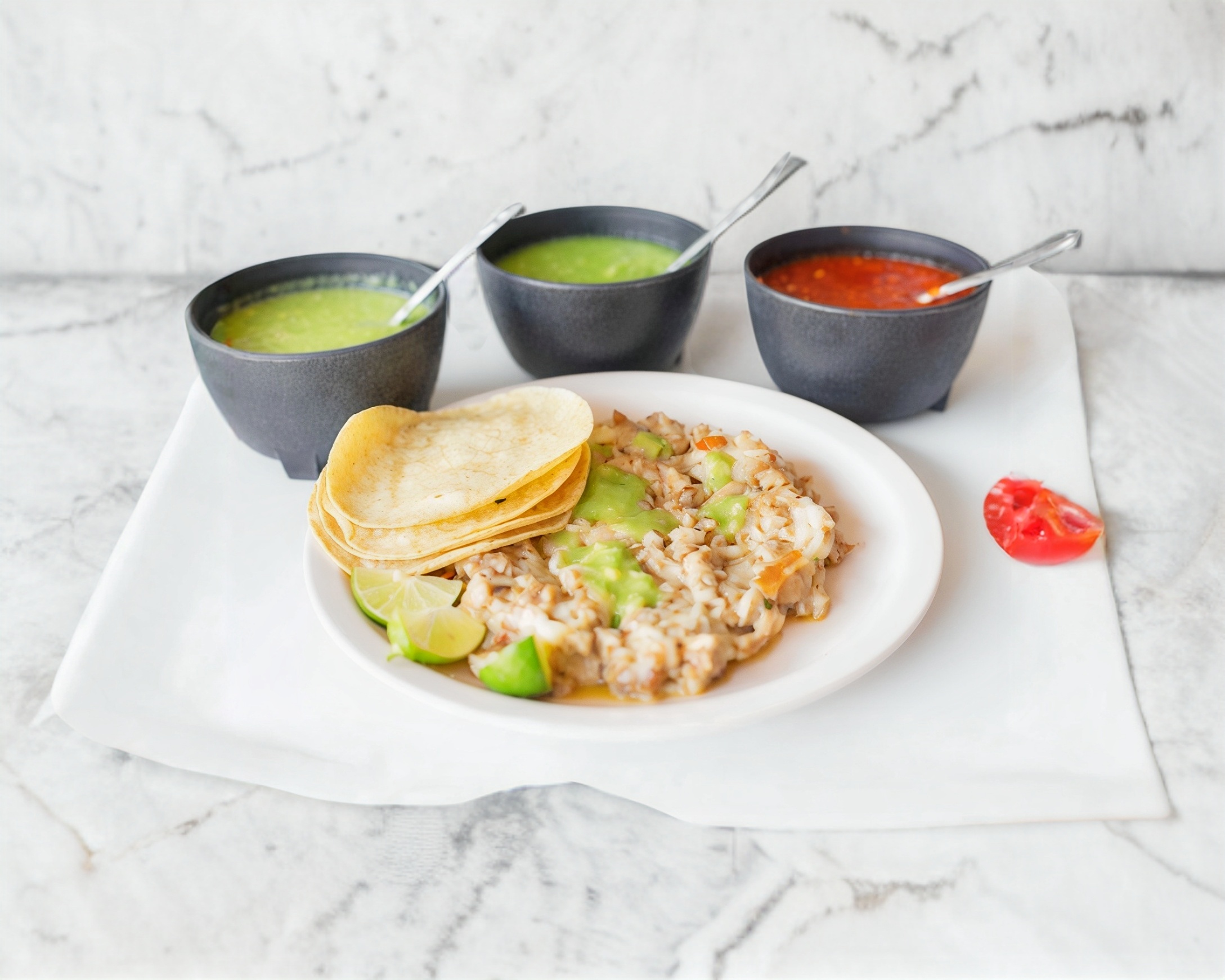 Tortillas, Salsas, limones, cebolla y cilantro