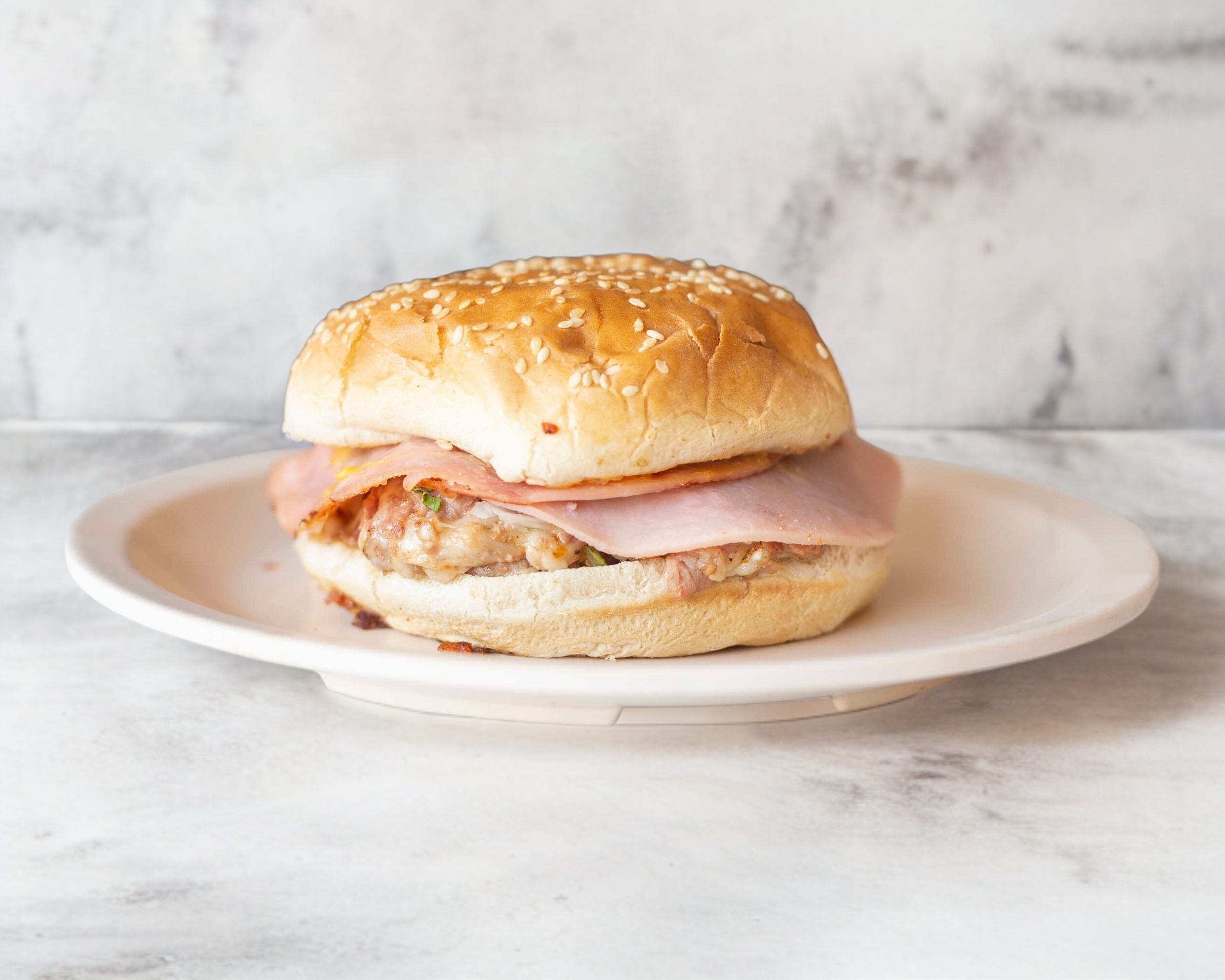 Pan parrillero, Mayonesa, Tocino, Queso asadero, Jamón, Queso amarillo