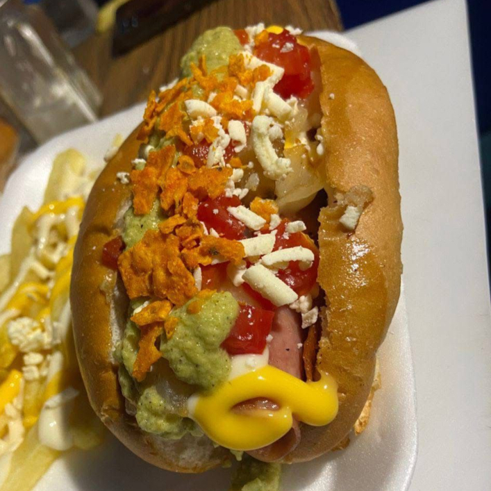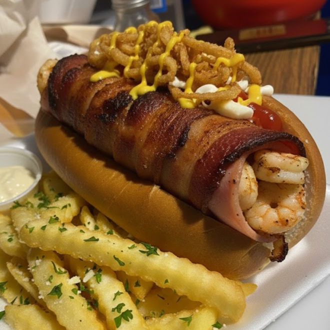 Salchicha grande envuelta en tocino y jamón relleno de camarón a la diabla