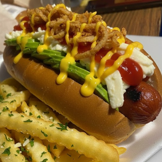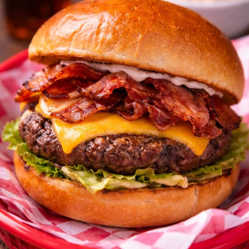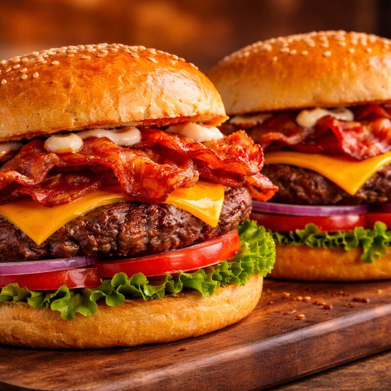 Hamburguesa de dos carnes de sirloin con dos quesos amarillo, tocino, jitomate, cebolla y lechuga