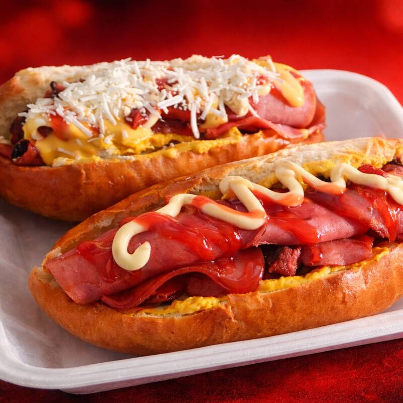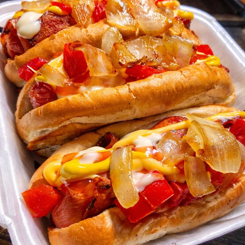 Salchicha grande envuelta en tocino y jamón rellena de camarón a la plancha.