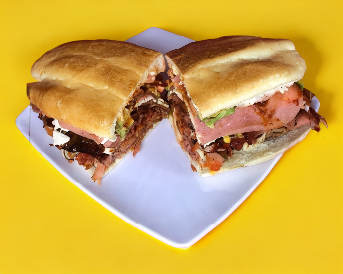 torta de bolillo normal con milanesa, pierna y queso, vegetales y picante